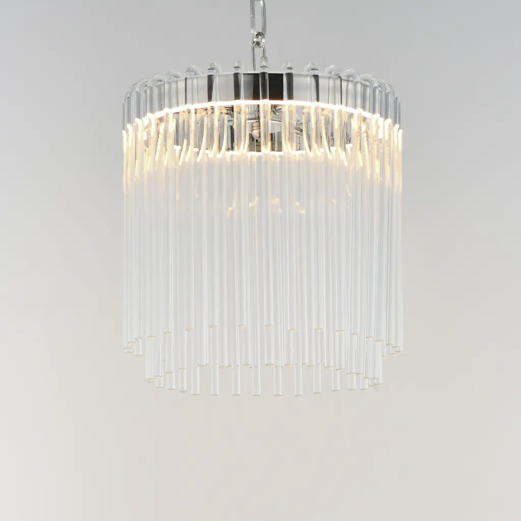 Clear glass rods elegantly curve to drape over a metal frame, encasing an integrated LED light source within. These ornamental glass rods form a luminous curtain, softly illuminated by the LEDs. The LED light source features an adjustable color temperature, allowing you to effortlessly switch between warm 2700K, neutral 3200K, and cool 4000K settings to suit any ambiance. Suspended by intricately designed chain links, the jewel-like glass skirt adds a touch of sophistication and refinement. Choose from two stunning frame finishes: Natural Aged Brass or Polished Nickel.