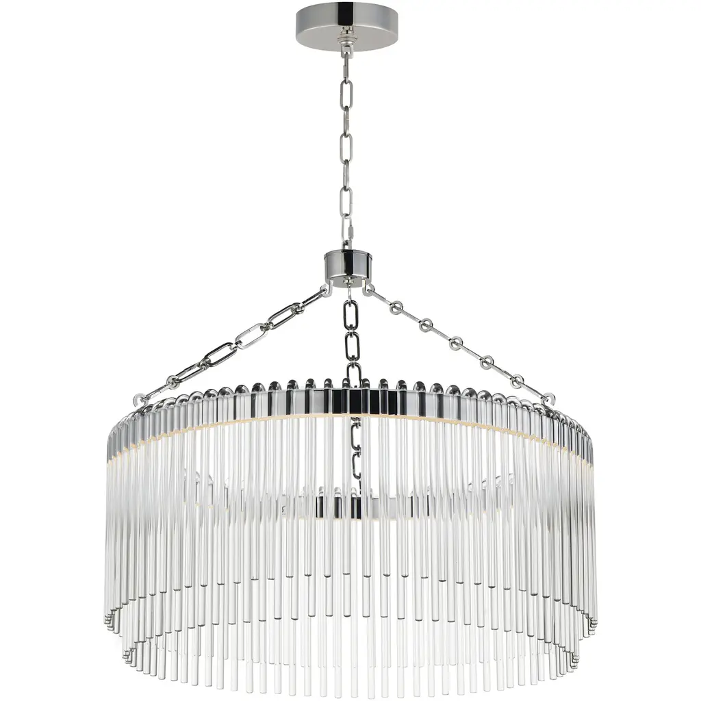 Clear glass rods elegantly curve to drape over a metal frame, encasing an integrated LED light source within. These ornamental glass rods form a luminous curtain, softly illuminated by the LEDs. The LED light source features an adjustable color temperature, allowing you to effortlessly switch between warm 2700K, neutral 3200K, and cool 4000K settings to suit any ambiance. Suspended by intricately designed chain links, the jewel-like glass skirt adds a touch of sophistication and refinement. Choose from two stunning frame finishes: Natural Aged Brass or Polished Nickel.