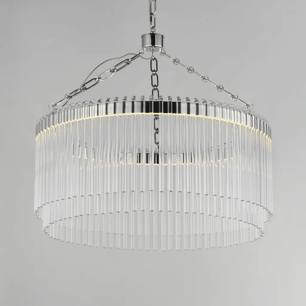 Clear glass rods elegantly curve to drape over a metal frame, encasing an integrated LED light source within. These ornamental glass rods form a luminous curtain, softly illuminated by the LEDs. The LED light source features an adjustable color temperature, allowing you to effortlessly switch between warm 2700K, neutral 3200K, and cool 4000K settings to suit any ambiance. Suspended by intricately designed chain links, the jewel-like glass skirt adds a touch of sophistication and refinement. Choose from two stunning frame finishes: Natural Aged Brass or Polished Nickel.