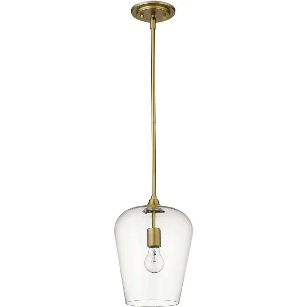 Designed with modern elegance in mind, this olde brass pendant is a stunning home decor upgrade. A single light beneath a clear glass shade is suspended from a sleek metal frame to create a magnificent display of light.