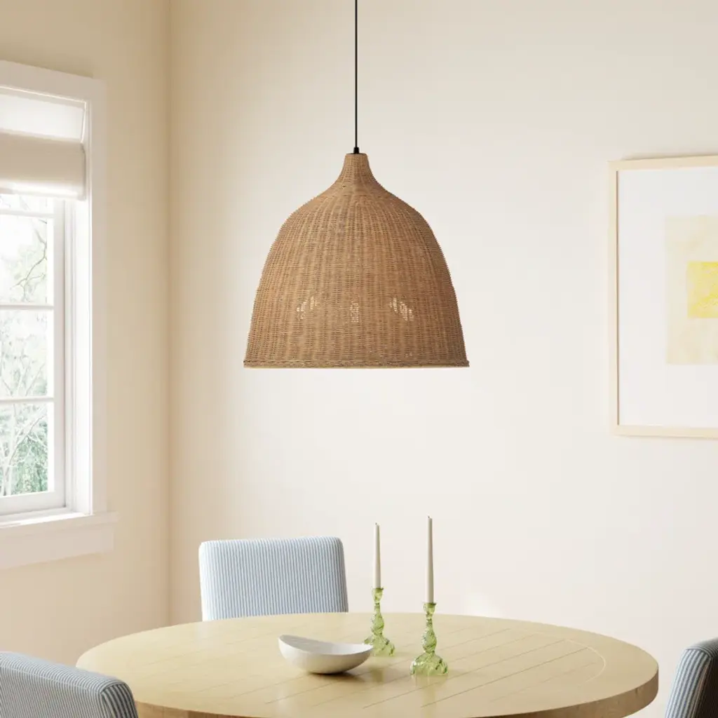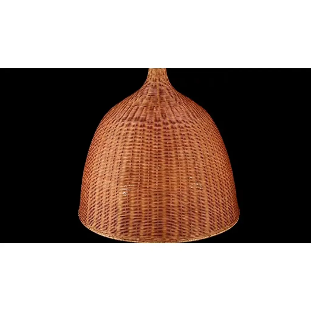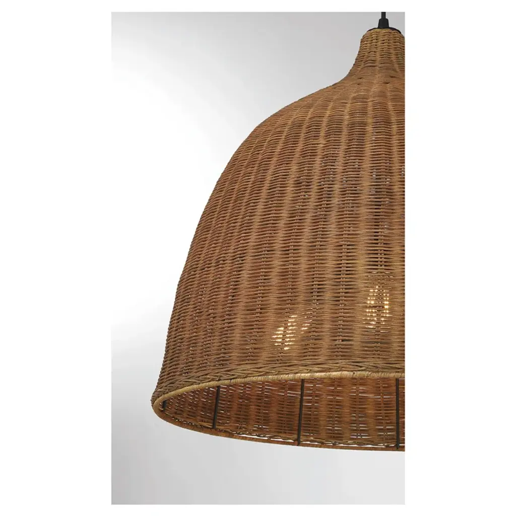 This new release item is a 3-light pendant that draws style inspiration from the beauty and craftwork of woven baskets. It features a wide, large shade of dark brown wicker that will illuminate any room beautifully. The simple hardware, in a cafe finish, allows the basket shade to take center stage. It is 23" wide and has an adjustable height ranging from 21" to 141". It uses three standard-size bulbs of up to 60 watts per bulb. Comes with 120" of cord.