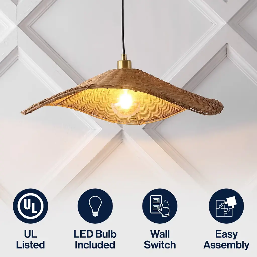 Jonathan Y Miko 24.5" Modern Coastal Organic Curve Rattan Led Pendant, Natrual Brown/brass Gold