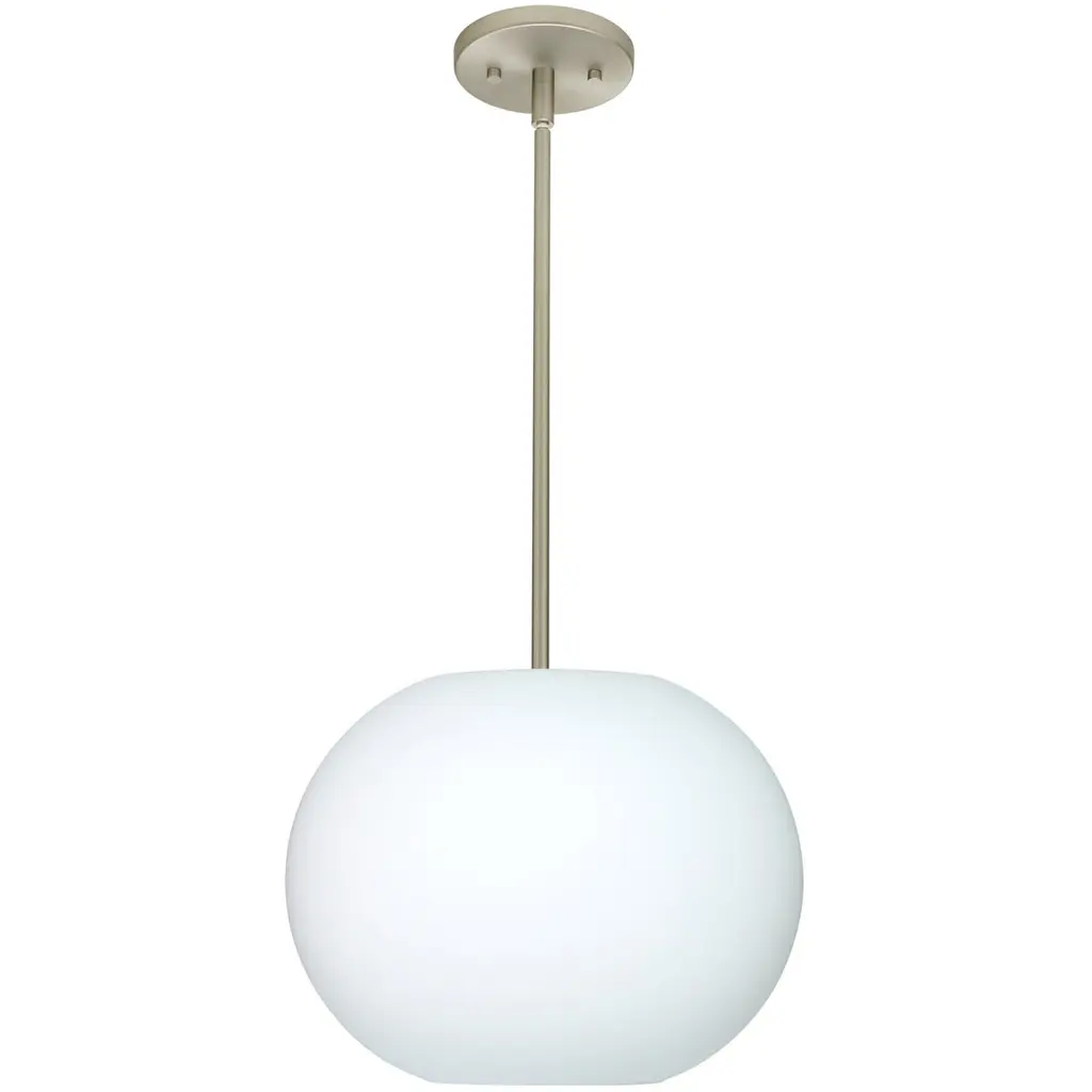 The Jordo pendant features a flattened globe-shaped glass, creating a refined contemporary look. Our Opal glass is a soft white cased glass that can suit any classic or modern decor. Opal has a very tranquil glow that is pleasing in appearance. The smooth satin finish on the clear outer layer is a result of an extensive etching process. This blown glass is handcrafted by a skilled artisan, utilizing century-old techniques passed down from generation to generation. The stem pendant fixture is equipped with an adjustable telescoping section, 4 connectable stem sections (3", 6", 12", and 18") and low Profile flat monopoint canopy. These stylish and functional luminaries are offered in a beautiful Satin Nickel finish.