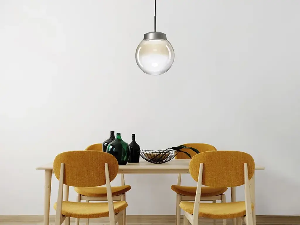 Single pendant lamp from the JOTTO collection diam. 25 cm, with brushed chrome rosette.Light source: GX53, Power: 1x10W LEDThe strength to fit into any context, the originality to be unparalleled. JOTTO's spherical shape means that it can easily fit into any environment, while the brushed steel support in which the sphere is set, thanks to the technical and severe touch given by the double inclination, makes it unique and clearly distinguishable. Placed in the same environment, JOTTO's multiple identities create coherence and continuity.