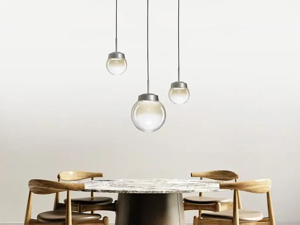 Suspension lamp from the JOTTO collection with 3 glass spheres: 2x diam. 15 cm and 1x diam. 25 cm. Opaque white rosette, transparent amber tinted borosilicate glass and brushed steel structure. Linear rose painted matt white 74x 9 cm.Light source: GX53, Wattage: 3x10W LEDThe strength to fit into any context, the originality to be unparalleled. JOTTO's spherical shape means that it can easily fit into any environment, while the brushed steel support in which the sphere is set, thanks to the technical and severe touch given by the double inclination, makes it unique and clearly distinguishable. Placed in the same environment, JOTTO's multiple identities create coherence and continuity.