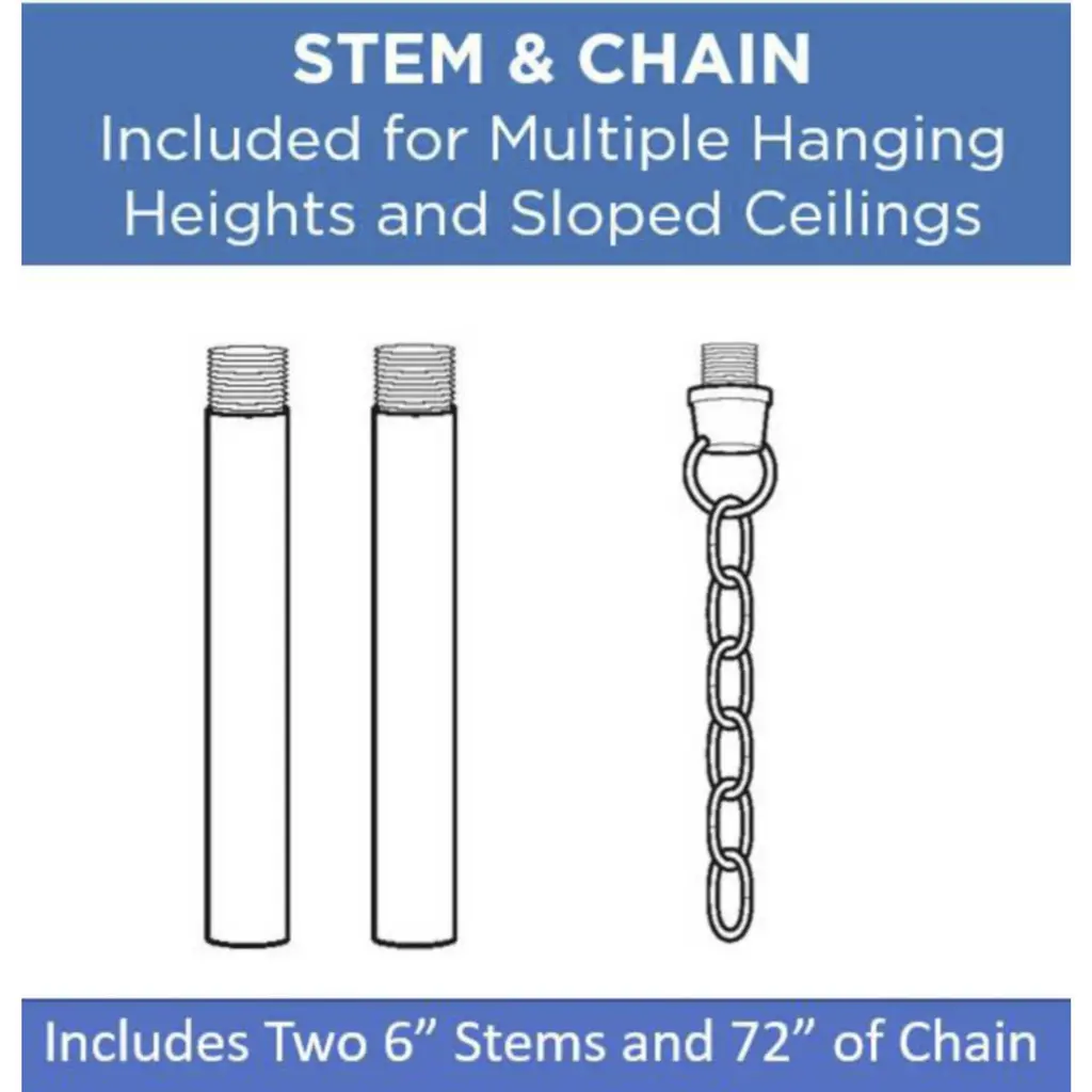 Gleeful simplicity defines this one-light mini-pendant from the Joy Collection. Refreshing and fashionable arcing forms of Antique Bronze metal arms enhance the etched white fluted glass. Coordinating fixtures from this collection let you decorate an entire home with confidence and style. Unique stem-hung construction carries the clean line all the way to the ceiling and, for sloped ceilings, six feet of 9 gauge chain is provided to allow the fixture to hang straight and level.