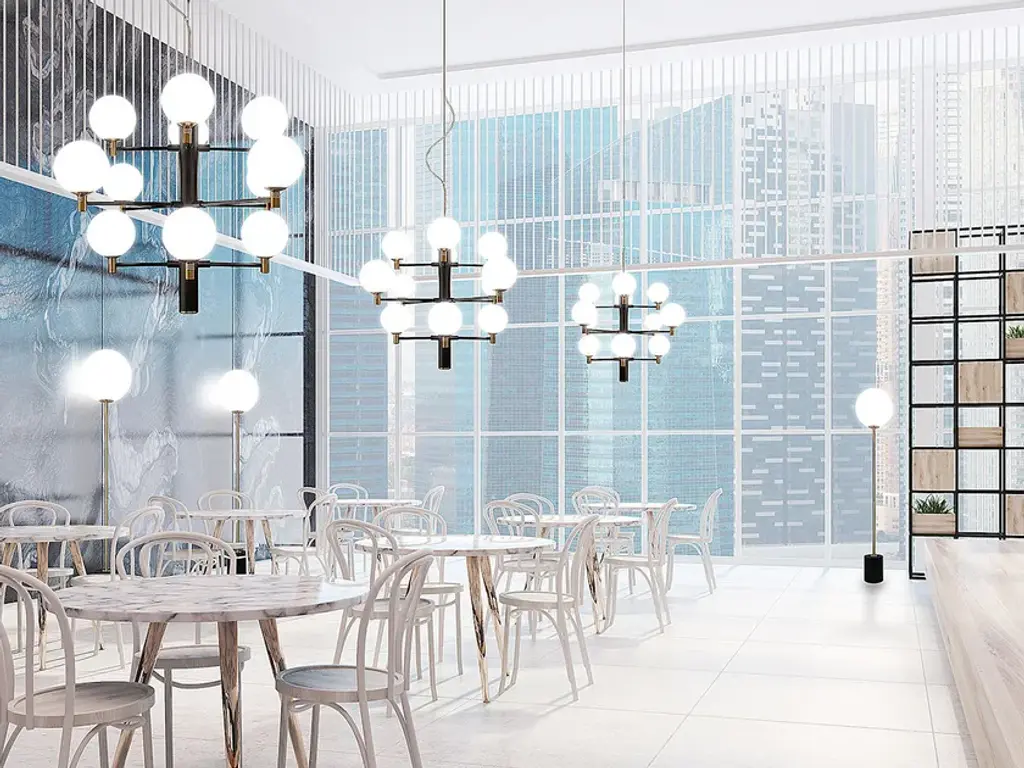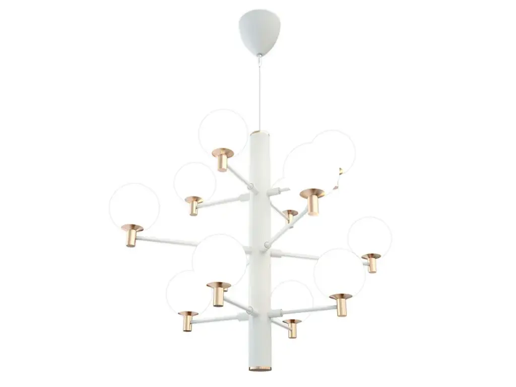 JUBILEUM is a painted metal pendant lamp with opal glass spheres.12 x G9, max 4W LEDCord and wire length 3mHook mountingOpal glass / brass.Introducing Jubileum, a light family that exudes a charming park-lamp-like ambiance. Both the pendant and the table lamp showcase spherical white opal glass shades adorned with elegant brass details. The table lamp features a single shade that can accommodate a powerful light bulb, providing excellent all-around illumination. Its design is complemented by a sturdy black marble stand. The pendant, also available in a white finish, boasts twelve smaller shades, offering a myriad of light sources to create a wonderful ambient lighting effect.