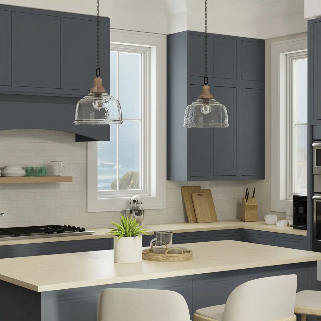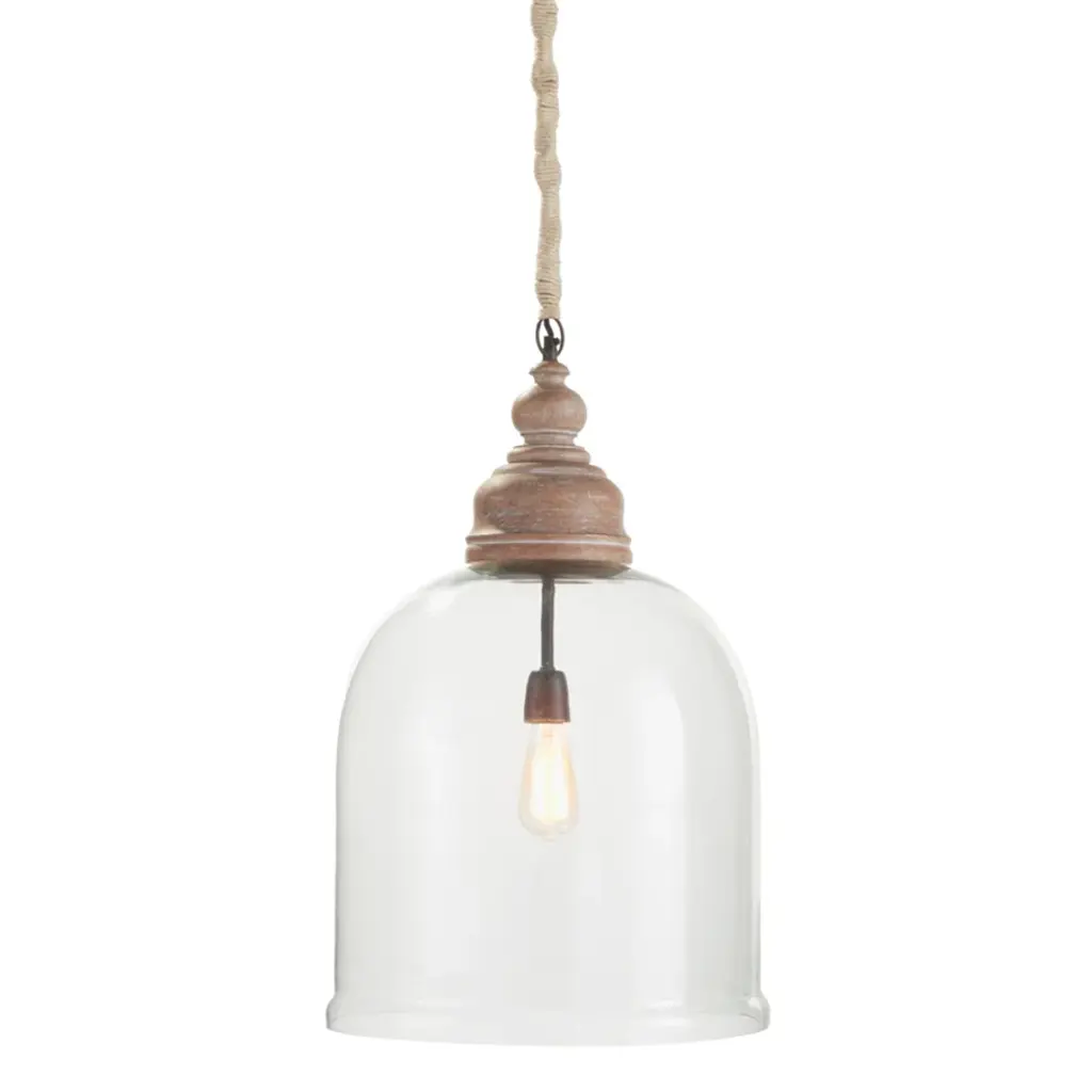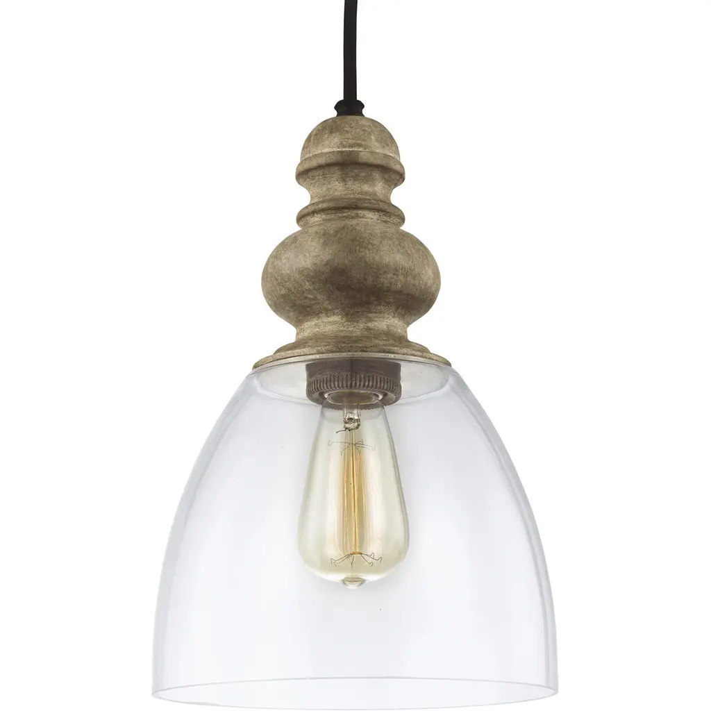Create a space awash in sunny, coastal style with this dome glass pendant. A finial sculpted of mango wood is hand finished in Grey Wash. The lamp is housed in a gorgeous, thick-rimmed Rippled Glass shade. Brimming with seaside vibes and rustic charm, this fixture is perfect as a dining room pendant, or to illuminate the kitchen island.