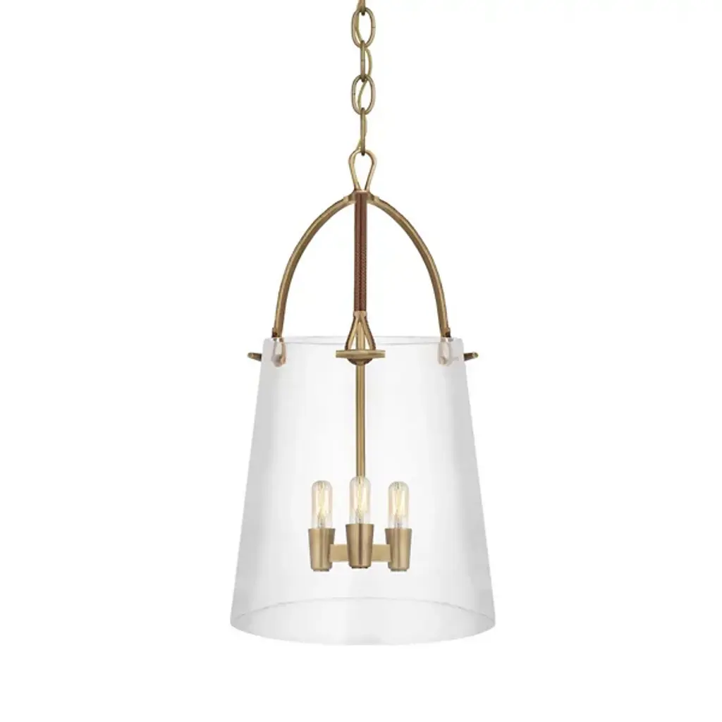 Farmhouse style gets a contemporary refresh in the Julian Pendant by Visual Comfort Signature, formerly known as Visual Comfort, A conical canopy sends a chain down to an arched steel handle. A bell-shaped shade crafted from clear glass hangs below, surrounding a series of incandescent bulbs held at its center by a short stem. A leather-covered stem lends a natural accent that contrasts elegantly against the sleekness of its metal and glass framing, while the piece’s generous light spills throughout the room.