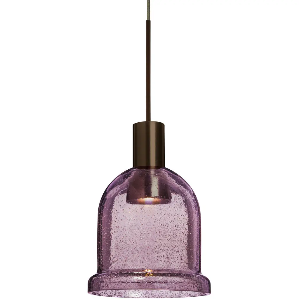The Juni 10 Pendant is composed of a transparent Plum glass cylinder, with an interesting bubble pattern blown randomly throughout the glass. The pleasing play of light through the bubble accents make for a striking affect, along with the prominent display of the lamp filament behind the glass. The stem pendant fixture is equipped with an adjustable telescoping section, 4 connectable stem sections (3", 6", 12", and 18") and low Profile flat monopoint canopy. These stylish and functional luminaries are offered in a beautiful Satin Nickel finish.