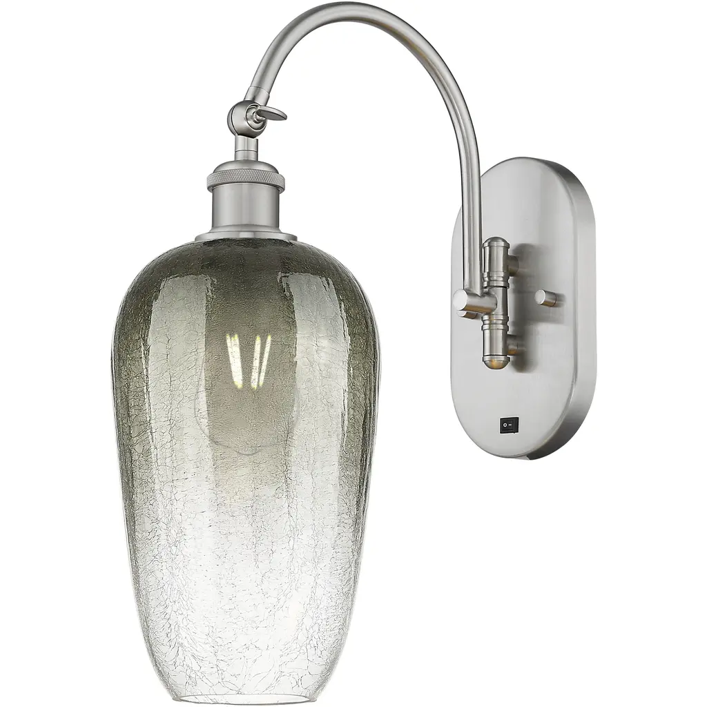The Juni 10 Plum Wall Pendant is a transitional wall sconce design composed of a transparent plum glass cylinder, with an interesting bubble pattern blown randomly throughout the glass The pleasing play of light through each shade's bubble accents make for a striking affect along with the prominent display of the lamp filament behind the glass. The rectilinear styled wall canopy includes standoff, cord support loop, and adjustable 10' suspension cord.These stylish and functional luminaries are offered in a beautiful Satin Nickel finish.