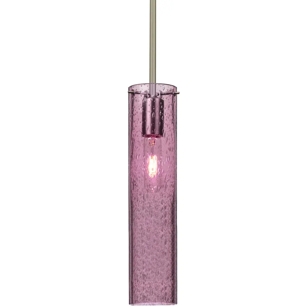 The Juni 16 Pendant is composed of a narrow transparent Plum glass cylinder, with an interesting bubble pattern blown randomly throughout the glass. The pleasing play of light through the bubble accents make for a striking affect, along with the prominent display of the lamp filament behind the glass. The stem pendant fixture is equipped with an adjustable telescoping section, 4 connectable stem sections (3", 6", 12", and 18") and low Profile flat monopoint canopy. These stylish and functional luminaries are offered in a beautiful brushed Bronze finish.