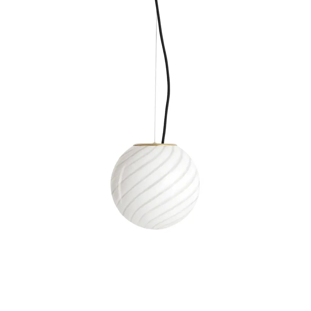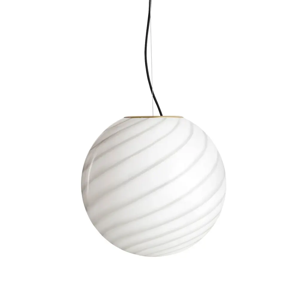 As the name suggests, Jupiter is large in scale and draws the eye upward. An aged brass metal frame is wrapped in white stretch fabric creating a dramatic effect even unlit. When lit, light fills the pendant with a gorgeous glow that bounces off the ringed canopy above. Available in two impressive pendant sizes.