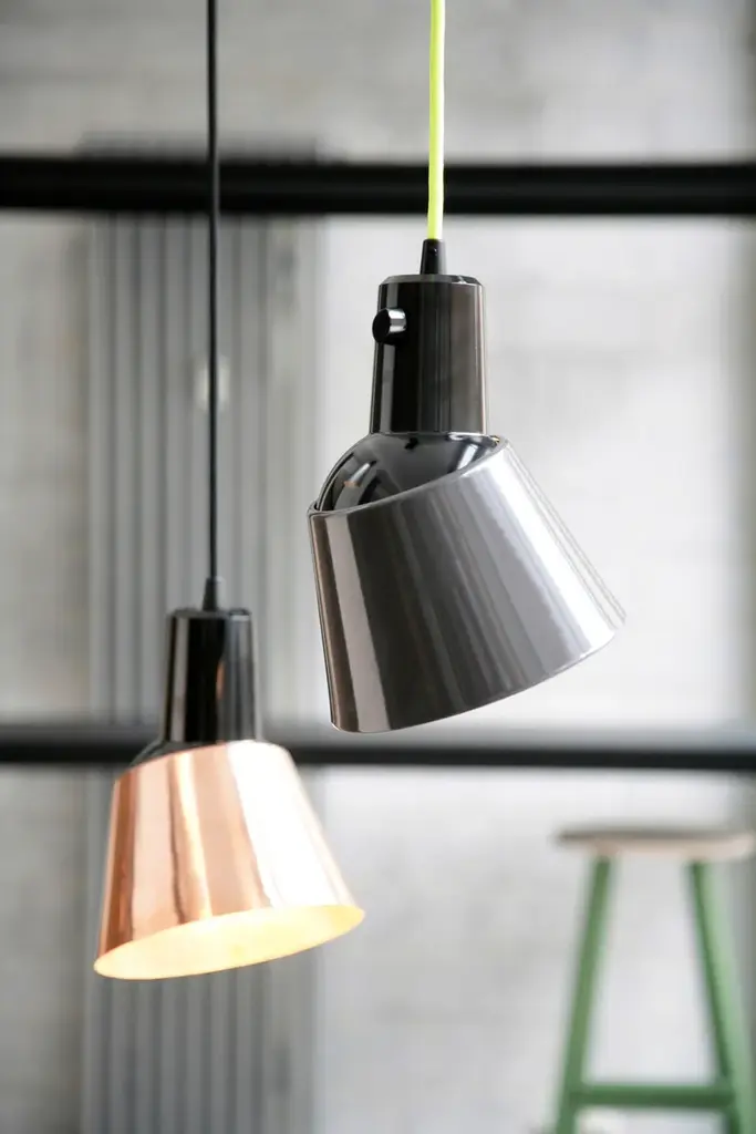 K831 – the most simple and beautiful way to adjust light. The swiveling shade allows to direct the ligth cone flexible where needed.The re-edition of the K831 is based on a rare draft from the 1930s. Initiated and designed by David Einsiedler and Joke Rasch in 2014.All parts are produced in germany by using original techniques and materials. The dome is made of bakelit and the lamp shade is hand pushed. It can be switched on with a classic rotary switch at the top dome.SPECIFICATIONSPendant lamp with movable lampshade for directional light.Dome and manual rotary switch: black bakelite.Lampshade: auminium solid or colour powder-coated, copper or enamelled.Textile cable, standard 3mtr.Canopy enclosed.The lamp is suitable for LED.We recommend E27 retrofit LED with 2700-3500k and between 6 and 10W (equals 40-60W)Do not use classic or halogen light bulbs with more than 40W.220-240V ~ 50/60hz, appliance class: II.All parts of this lamp are produced in Germany and final assemblance is made in Hamburg.