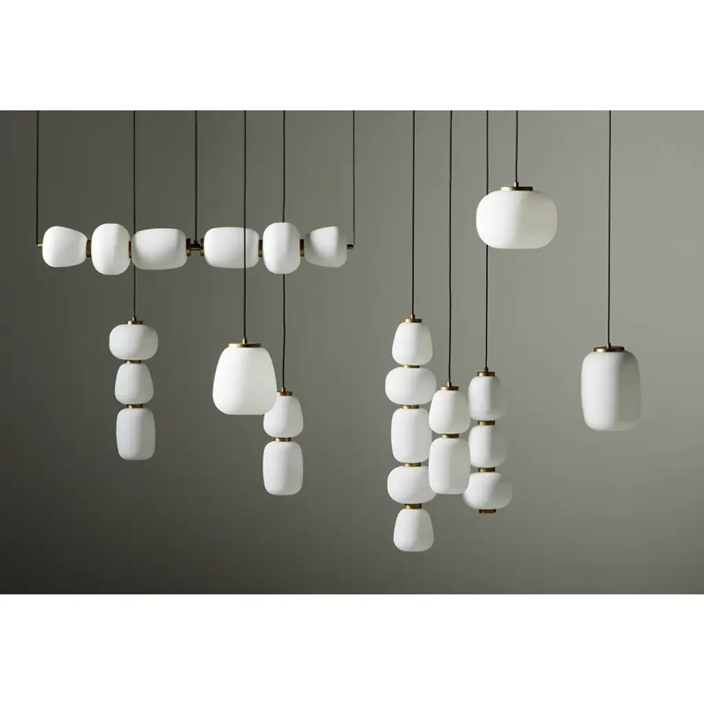 An organic silhouette and rounded glass shades make this 2-light pendant a mid-century standout. Two satin-white glass shades are embellished with bands of gold-hued metal. The LEDs are integrated within the shades, diffusing a warm glow throughout your space. This pendant is also compatible with sloped ceilings and dimmer switches.