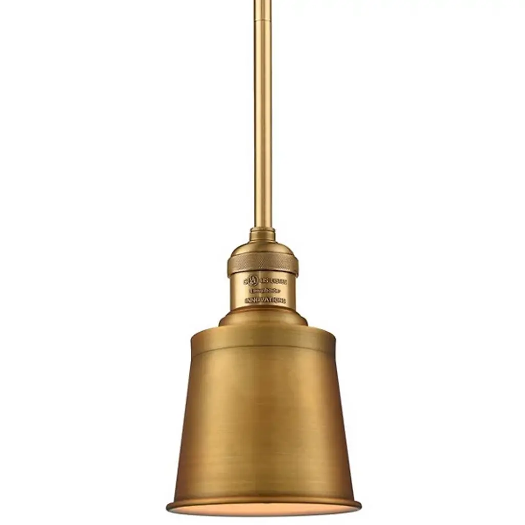 Bring a traditional visual touch and delicate light to your home with the Kailyn Mini Pendant by Alder & Ore. Crafted from cast brass, this fixture drops from a circular canopy by a slender downrod. Its curved base boasts a subtle knurled detail, lending the piece an industrial touch that instantly adds character. Its cone-shaped metal shade surrounds a single bulb, funneling its warm light downward to provide an inviting light and create an intimate atmosphere.