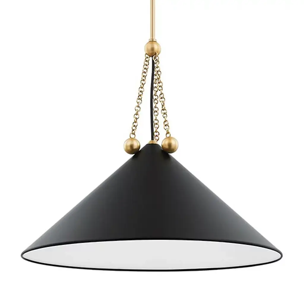 Discover the Kalea Pendant by Mitzi, seamlessly showcasing transitional style with Bohemian boldness. A slender central stem adorned with delicate orbs and chain accents upholds the conical shade. The low-profile canopy cradles the stem with elegance. This pendant artfully combines Boho and Bauhaus influences. Intricate chainwork, accompanied by orb embellishments and a metal cap, adorns the angular shade, evoking a touch of jewelry-like intricacy. The reflective interior radiates a warm ambiance below, while the soft exterior creates clever contrast, striking an inspired balance of ornamentation and architecture.