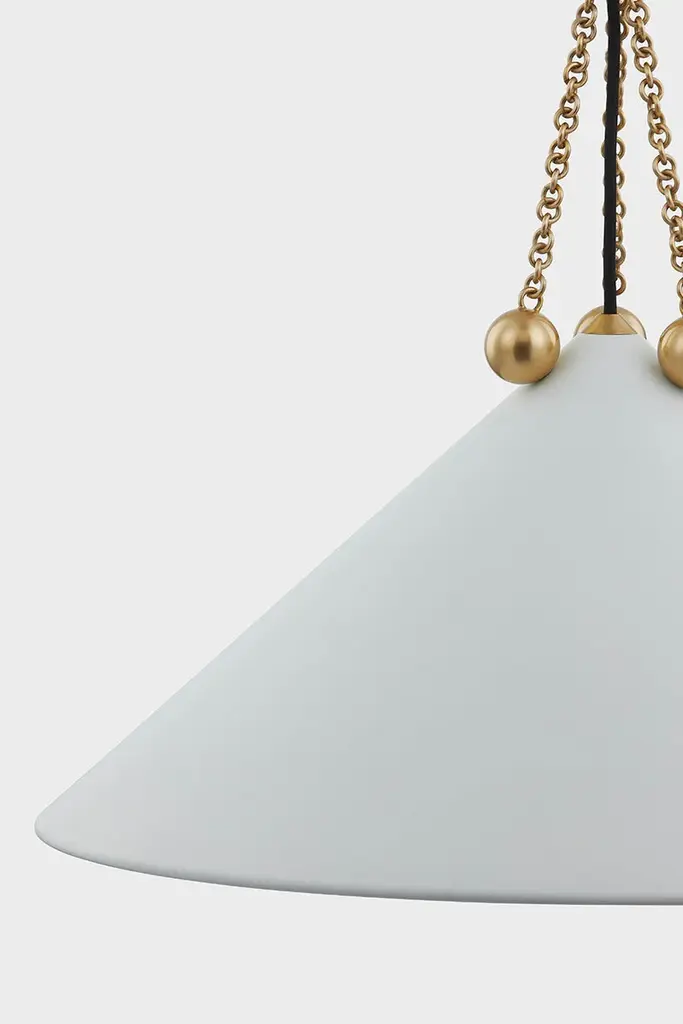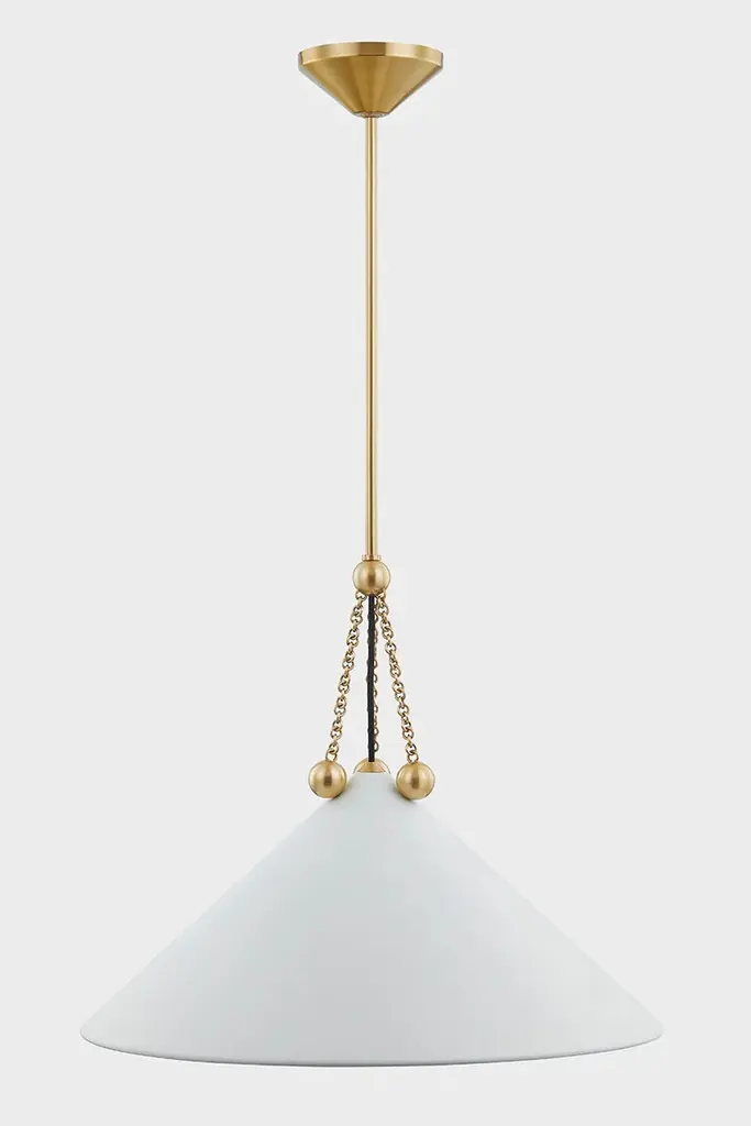 Boho meets Bauhaus in this ornamental and architectural pendant. The detailed Aged Brass chainwork, orb accents, and metal tip at the top decorate the straightforward, angular shade with jewelry-like accents. The all-over Soft White finish feels crisp and clean, while the Soft Black shade has a Soft White interior for a more dramatic effect.