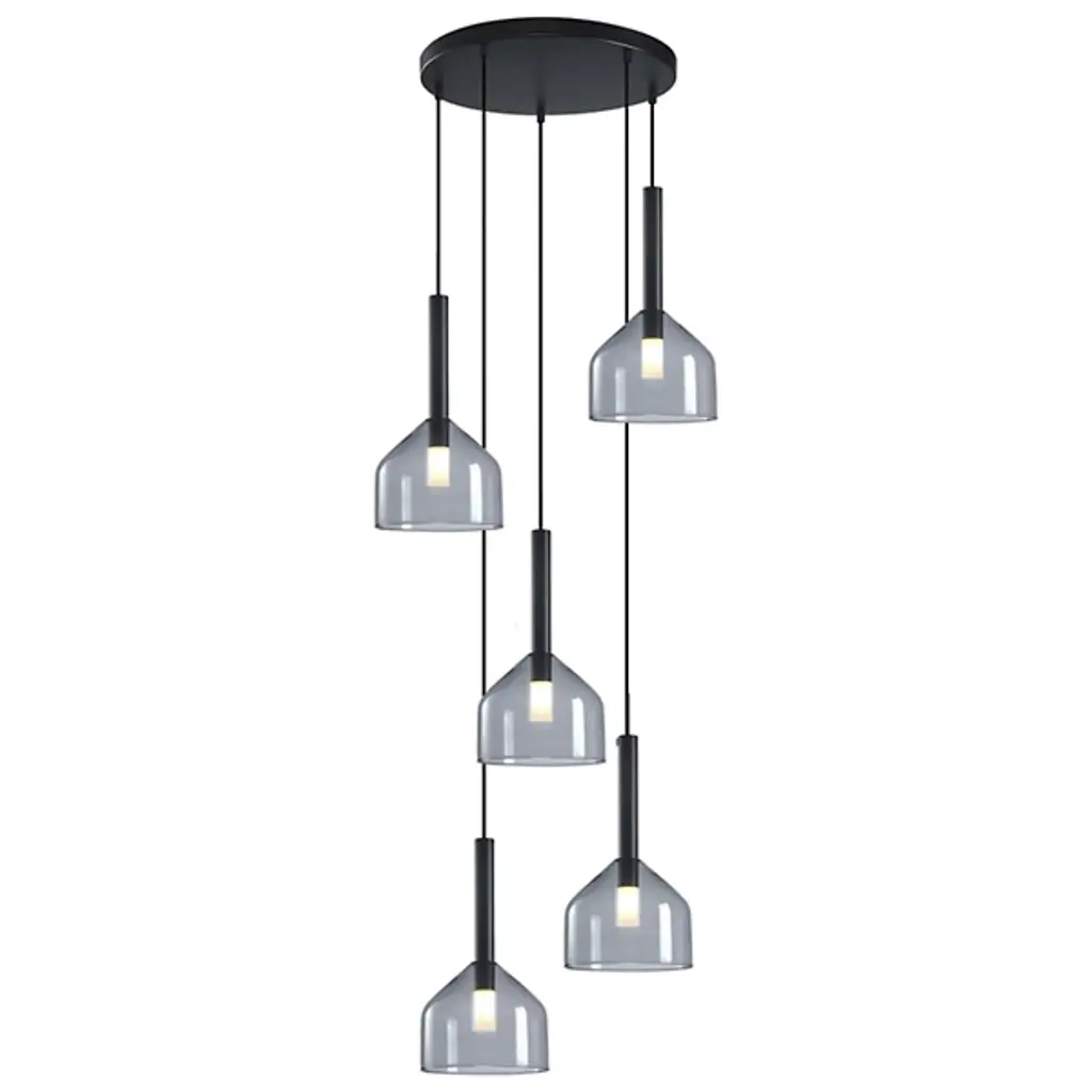 The Kali Multi Light Pendant from Artcraft is a lighting solution that blends contemporary and mid-century modern aesthetics. It features tapered shades of smoked glass arranged in an elegant cascade, with each shade being outfitted with a white bulb cover and positioned at a different height. It is sloped ceiling adaptable for versatility, letting you bring ample amounts of LED illumination to your space. The cylindrical crowns at the top of the shades are secured by a ceiling canopy for stability.