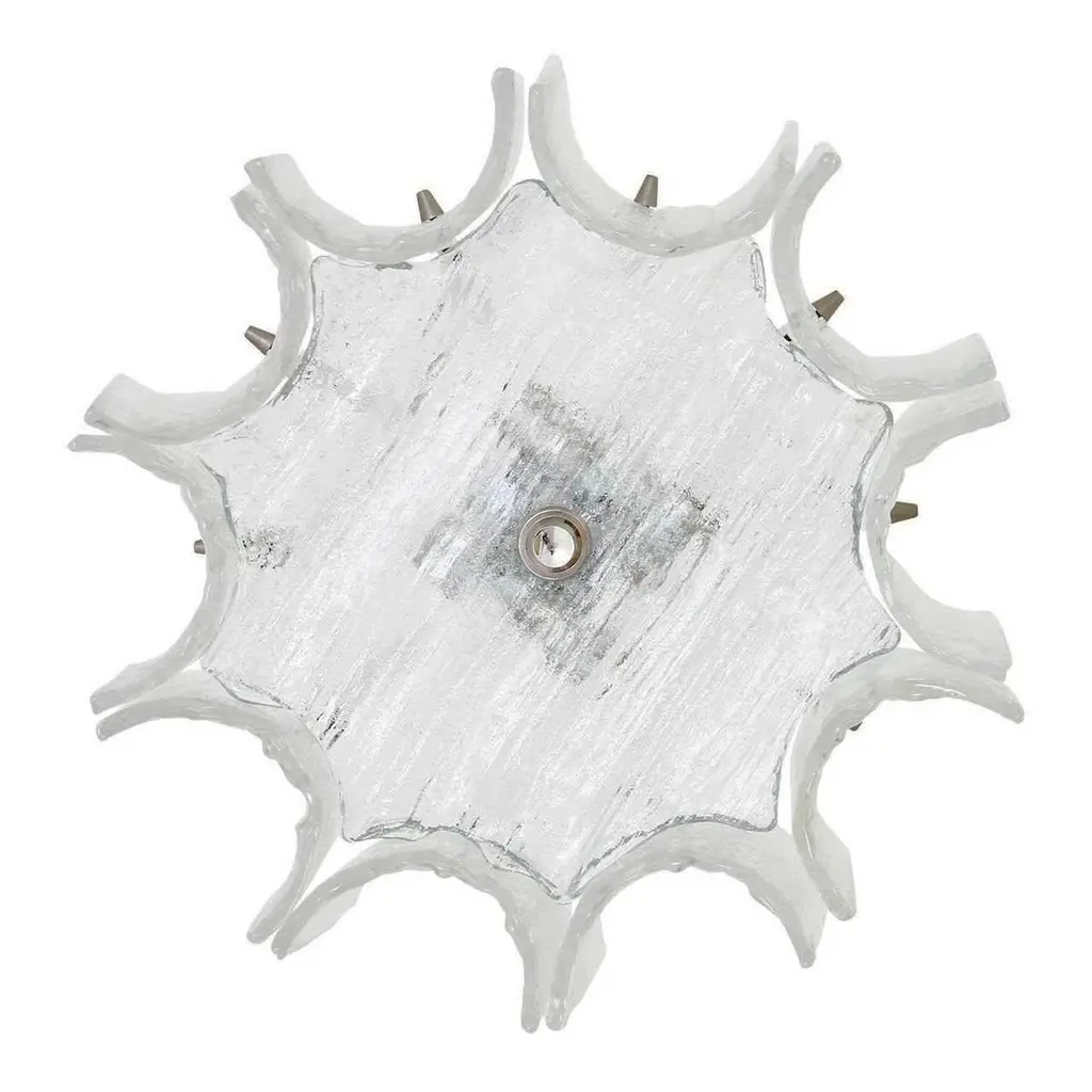 A beautiful star-shaped light fixture by Kalmar Vienna, Austria, manufactured in midcentury, circa 1970 (late 1960s or early 1970s).Two lights are available.It is made of frosted clear glass, a white lacquered frame, and nickel-plated (chrome) bolts, rod, and canopy.The height of the body without rod is 8.7 inch / 22 cm. We can provide a rod in any size for free of charge.The lamp has four sockets for E14 candelabra screws base bulbs or LEDs.It is possible to install this fixture in all countries (US, UK, Europe, Asia, Canada,) although it may be necessary to purchase different light bulbs suitable to local electricity. It also can be used with a dimmer.The lights are ready to use.