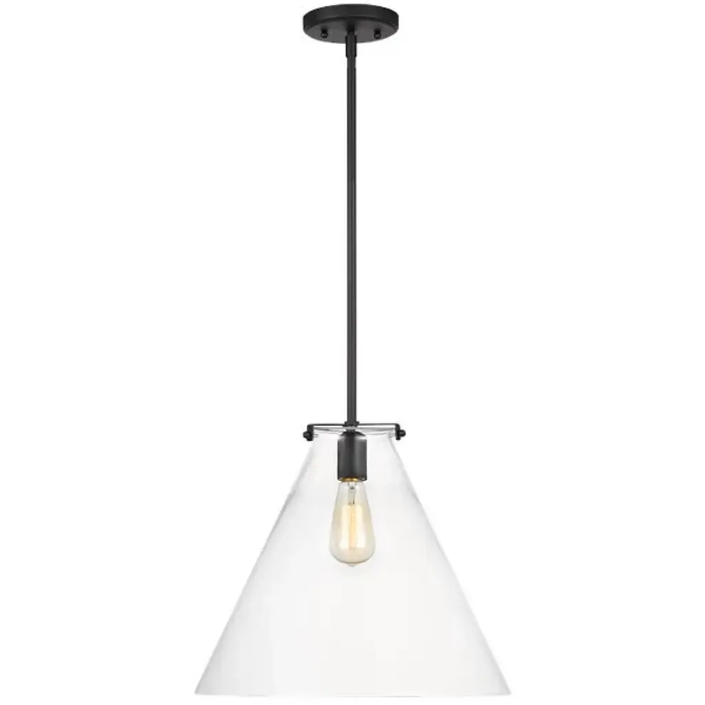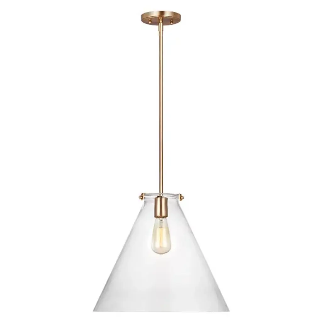 Provide an airy, contemporary accent to your inside spaces with the Kate Cone Pendant by Visual Comfort Studio, formerly known as Sea Gull Lighting, A simple design on its initial appearance, it starts by suspending a single socket from a stepped-disc ceiling mount via a support rod. A damp rating on the socket allows it to be installed anywhere indoors, while a large, conical shade made from clear glass sweeps down around the lamping, gentling glare from the sides while pouring out a wide wash of light below.