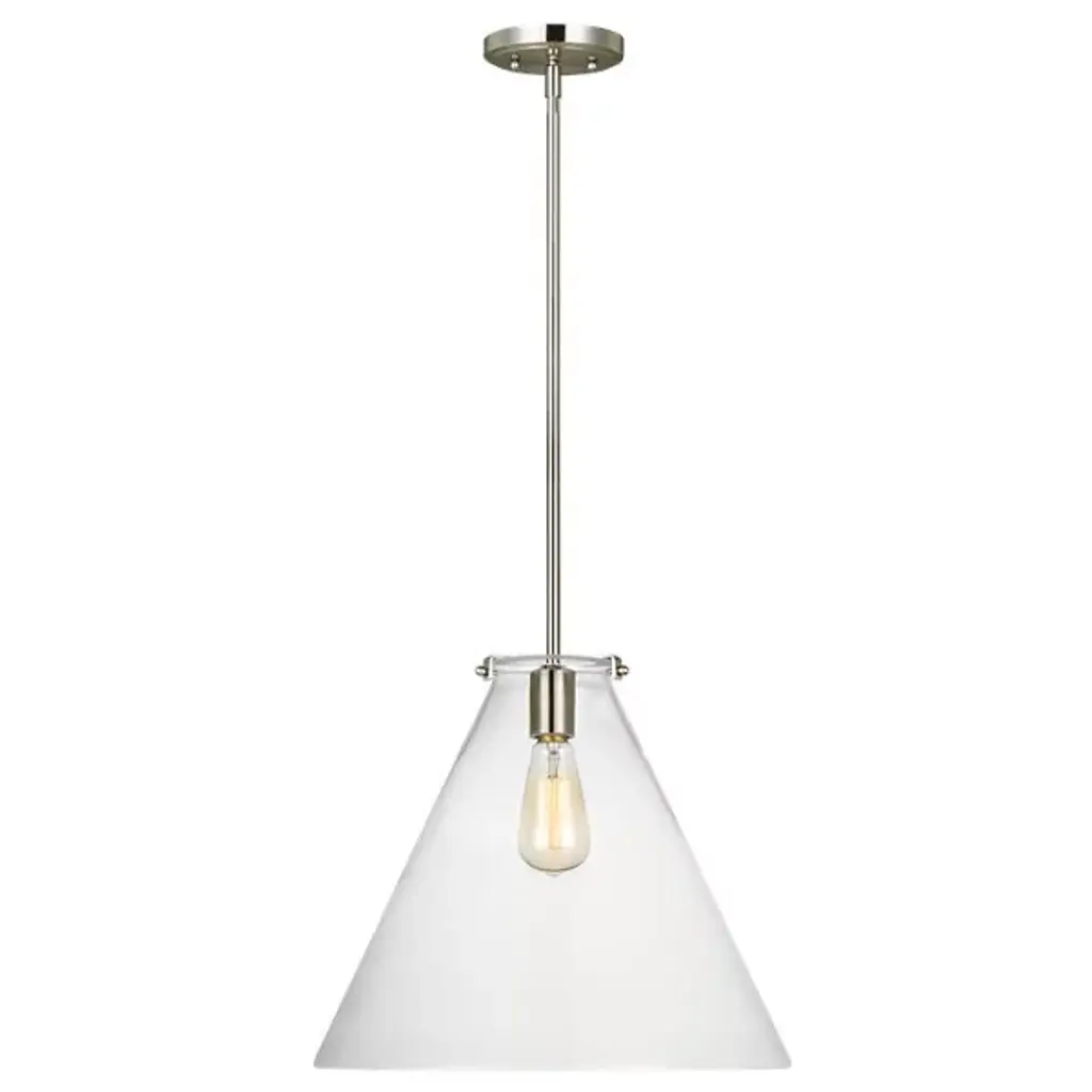 Provide an airy, contemporary accent to your inside spaces with the Kate Cone Pendant by Visual Comfort Studio, formerly known as Sea Gull Lighting, A simple design on its initial appearance, it starts by suspending a single socket from a stepped-disc ceiling mount via a support rod. A damp rating on the socket allows it to be installed anywhere indoors, while a large, conical shade made from clear glass sweeps down around the lamping, gentling glare from the sides while pouring out a wide wash of light below.