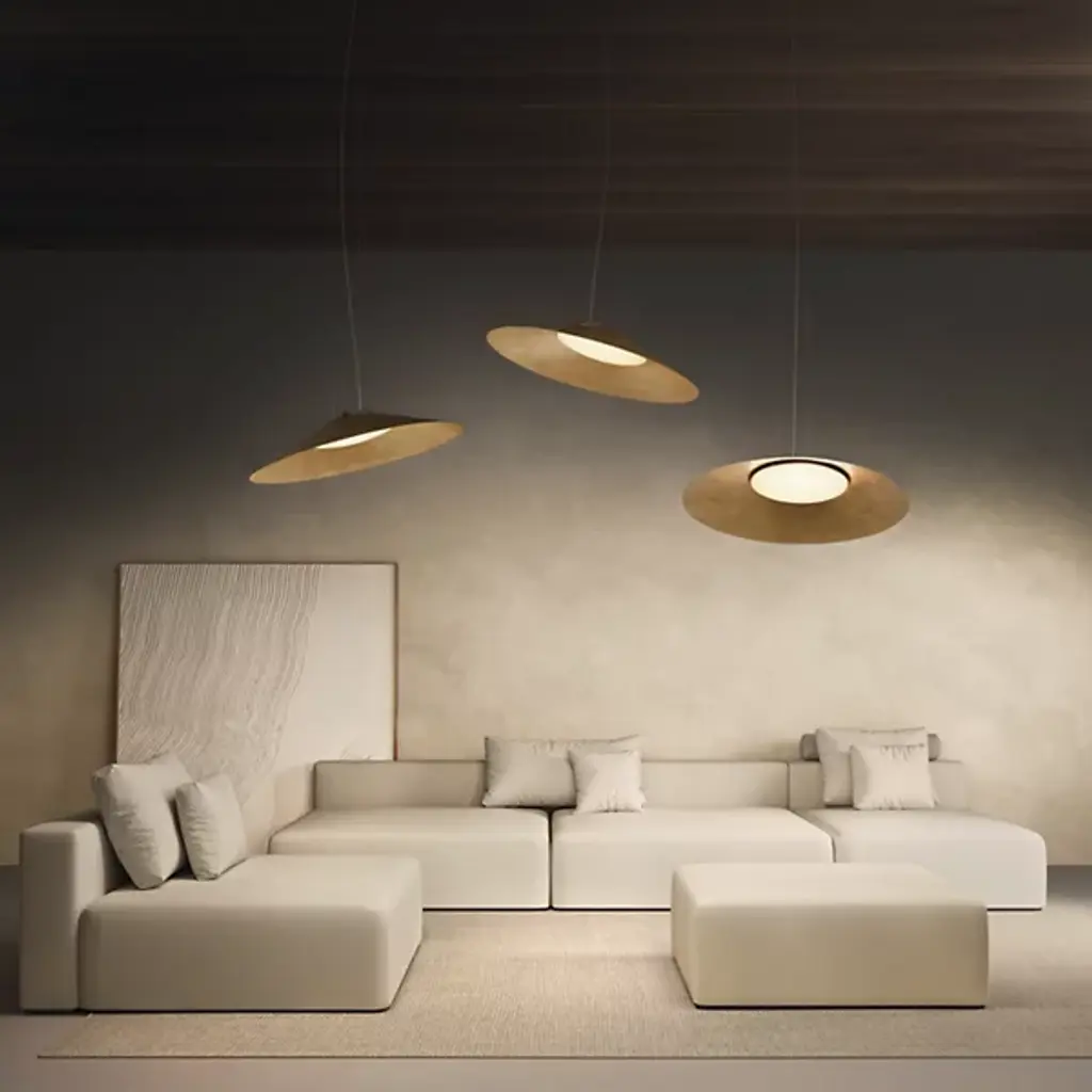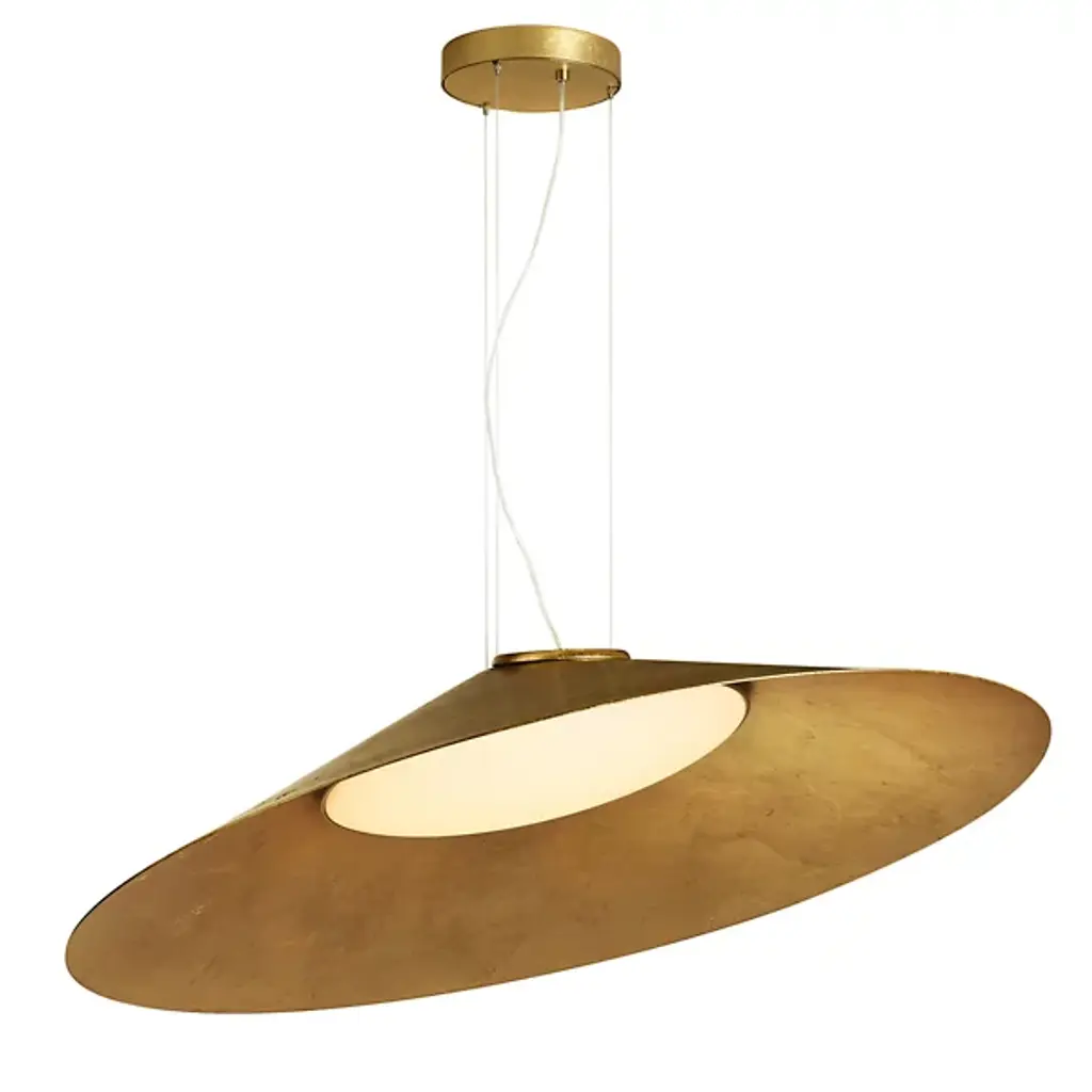 The Kate LED Pendant from kdln is an artistic suspension light that mixes clean, contemporary lines with a bit of vibrant, artisan-style character. Designed by Francesca Smiraglia and made in Italy, it utilizes three slim cables to suspend an offset aluminum dish structure slightly to one side, centering a strong, efficient LED lamp beneath a flat, rounded diffuser of mouth-blown glass. The open conical shade is surfaced in a rich, metallic hue, casting a mix of reflected light and radiant glow below, which can highlight areas of interest or be directed slightly away for a softer, less direct light.