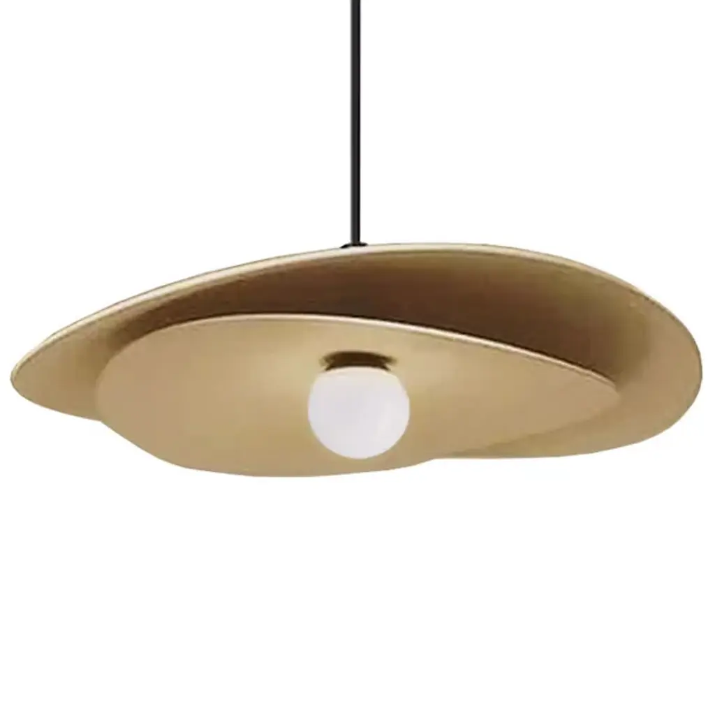 The Kate LED Pendant from kdln is an artistic suspension light that mixes clean, contemporary lines with a bit of vibrant, artisan-style character. Designed by Francesca Smiraglia and made in Italy, it utilizes three slim cables to suspend an offset aluminum dish structure slightly to one side, centering a strong, efficient LED lamp beneath a flat, rounded diffuser of mouth-blown glass. The open conical shade is surfaced in a rich, metallic hue, casting a mix of reflected light and radiant glow below, which can highlight areas of interest or be directed slightly away for a softer, less direct light.