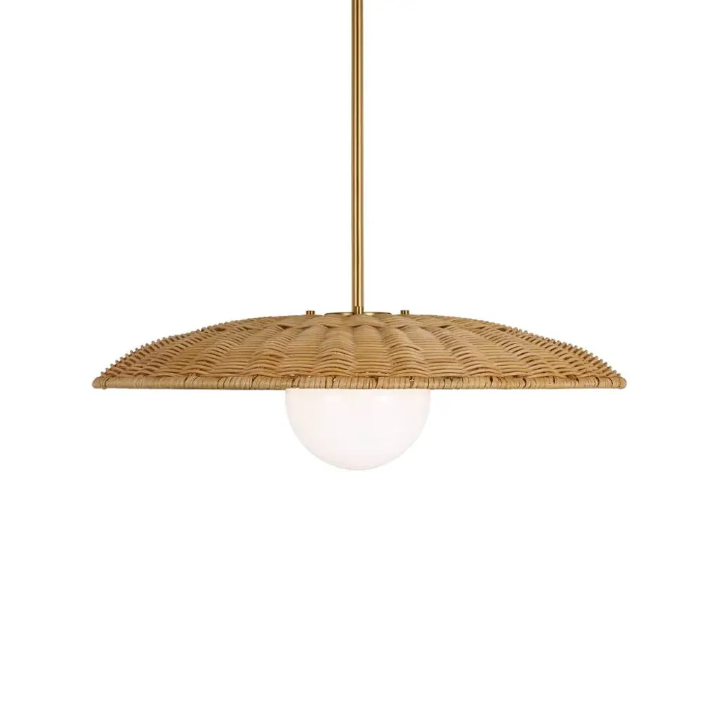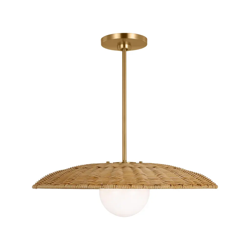 The Kate Spade Mari Pendant Light from Visual Comfort & Co combines natural rattan with sleek Burnished Brass accents for a striking yet refined coastal look. Its woven shade encases a milk glass orb that emits a soft, diffused glow, creating a warm and inviting atmosphere. The open design enhances light flow, making it perfect for coastal-inspired kitchens, dining rooms, or entryways. Damp-rated for versatile placement, this pendant effortlessly blends relaxed charm with sophisticated elegance. Highlights