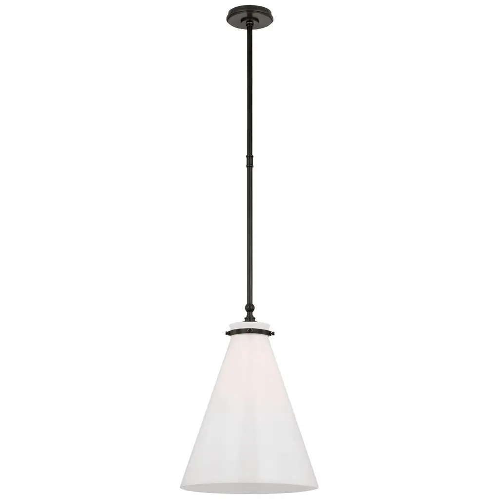 At home in a variety of decors, this pendant from designer Thomas O'Brien is crafted of brass with a bronze finish and conical white glass shade. With its compact size, we especially love this paired in multiples above a dining room table or kitchen island. Hardwired.