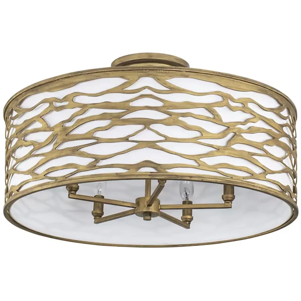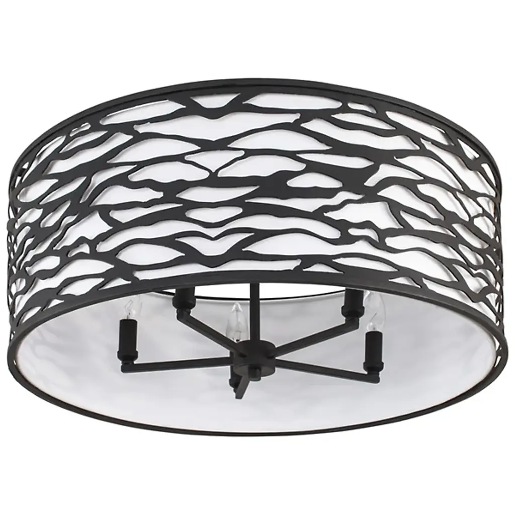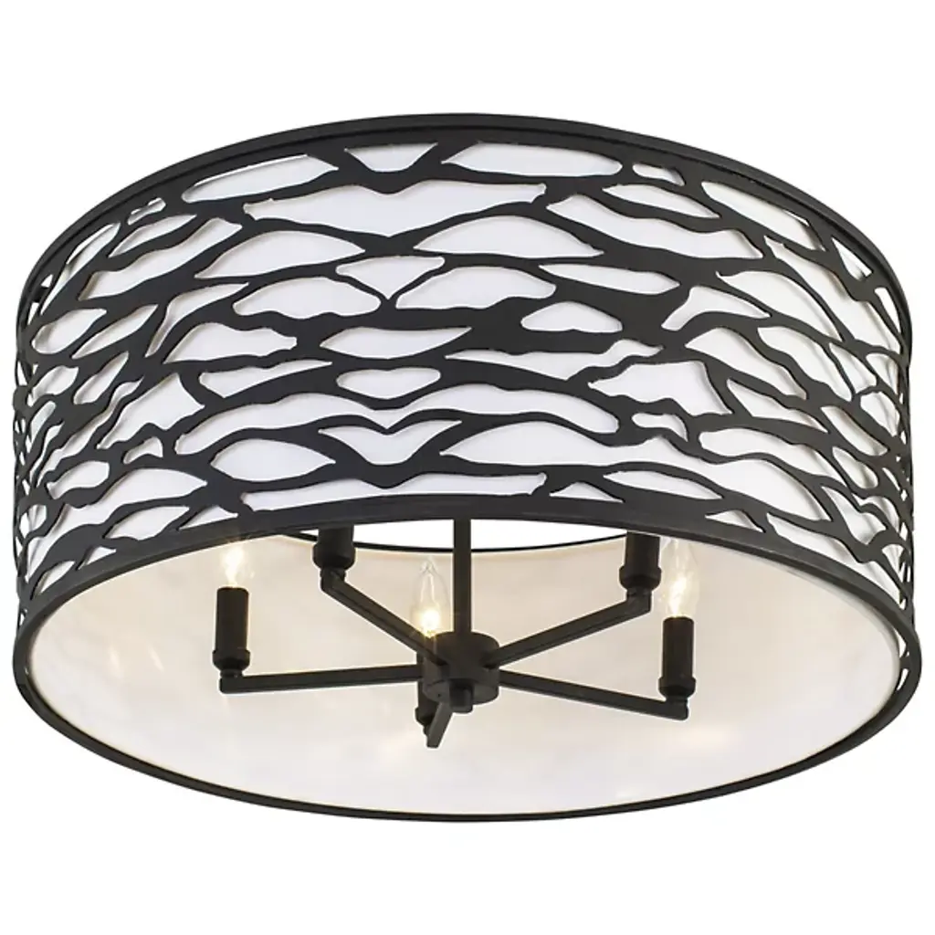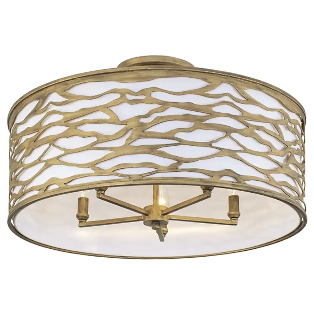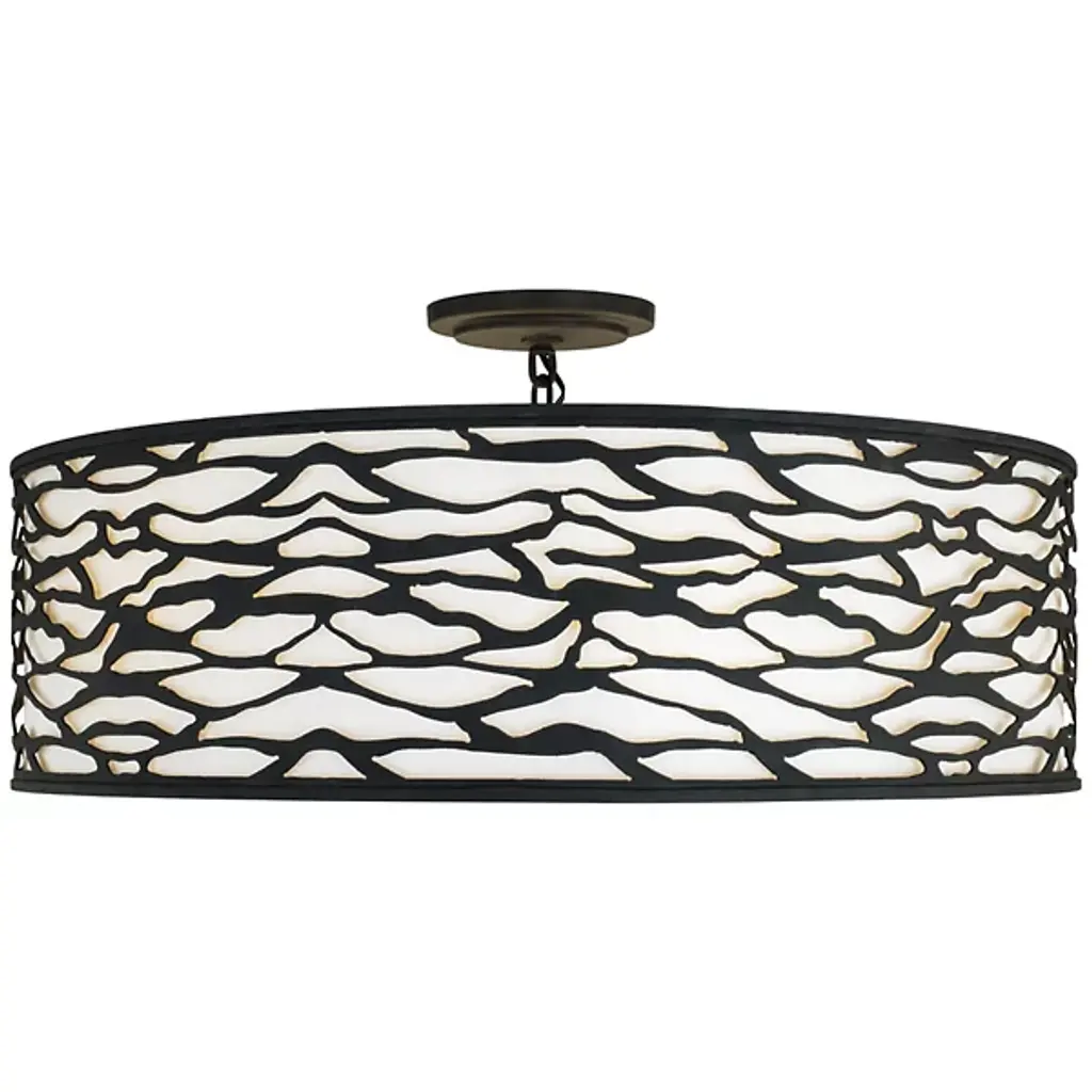 See rolling hills or shimmering waves in this smooth, modern fixture. The design of the Kato Semi-Flushmount by Varaluz was inspired by the simultaneously watery and hilly topography near Mankato, MN. It has a drum-shaped Linen shade overlaid by a Steel cage with intricate and organic-looking openings. Light shines brightly downward and more softly through the linen and patterned cage. Use this semi-flushmount to add texture as well as plentiful ambient light in interiors with lower ceilings, like bedrooms, entryways or kitchens.