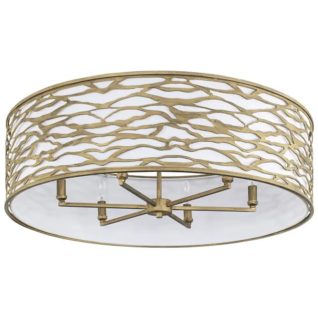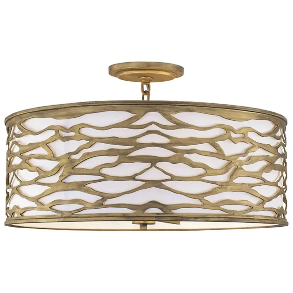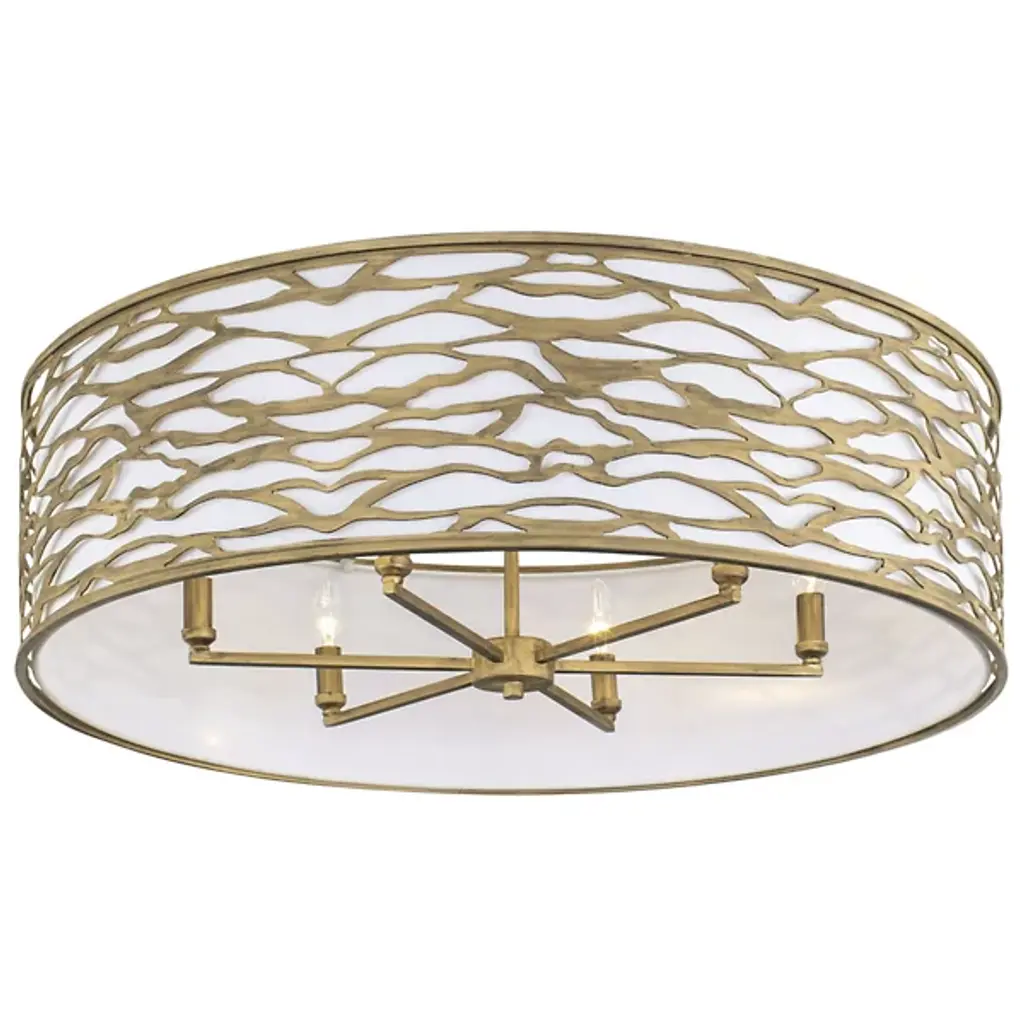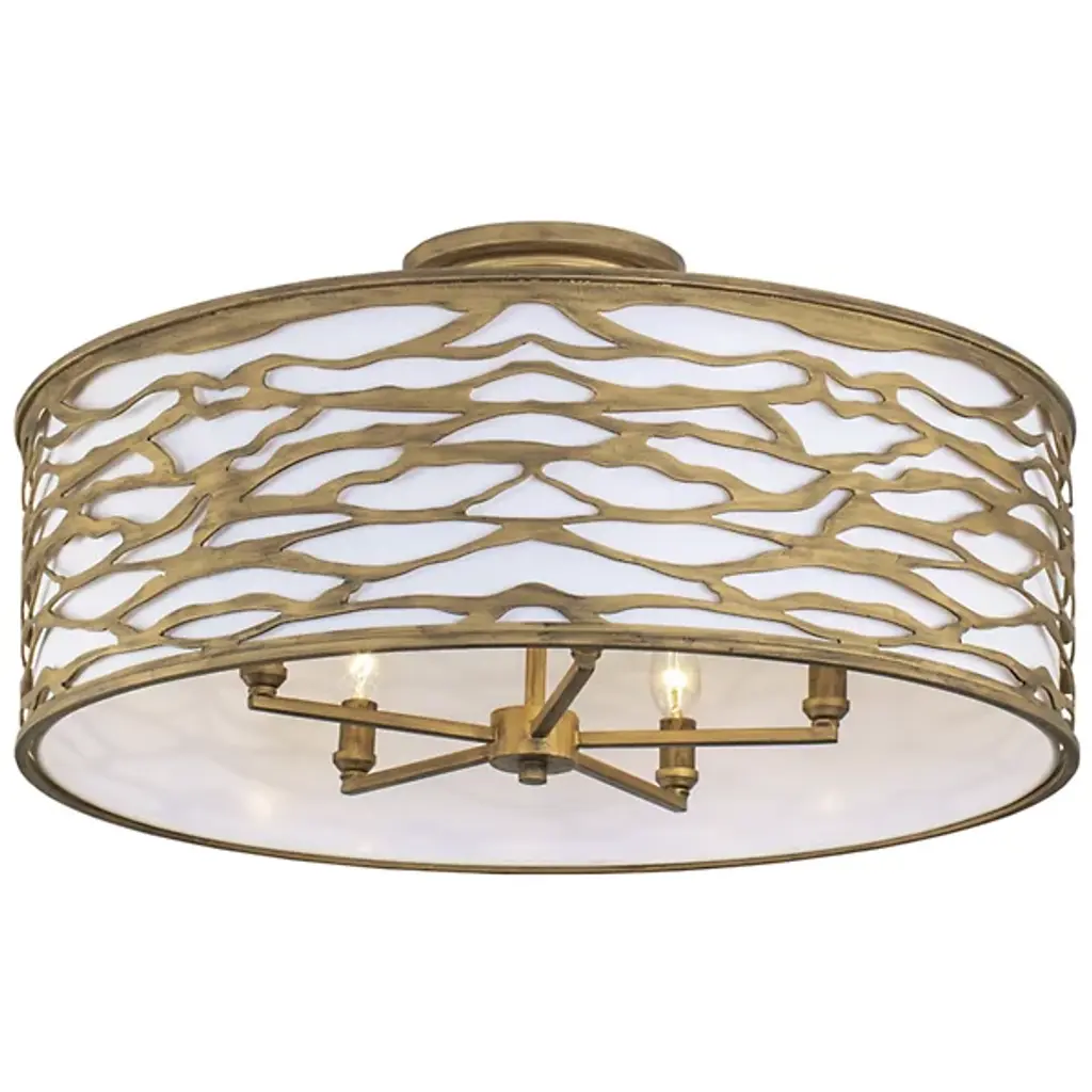 See rolling hills or shimmering waves in this smooth, modern fixture. The design of the Kato Semi-Flushmount by Varaluz was inspired by the simultaneously watery and hilly topography near Mankato, MN. It has a drum-shaped Linen shade overlaid by a Steel cage with intricate and organic-looking openings. Light shines brightly downward and more softly through the linen and patterned cage. Use this semi-flushmount to add texture as well as plentiful ambient light in interiors with lower ceilings, like bedrooms, entryways or kitchens.