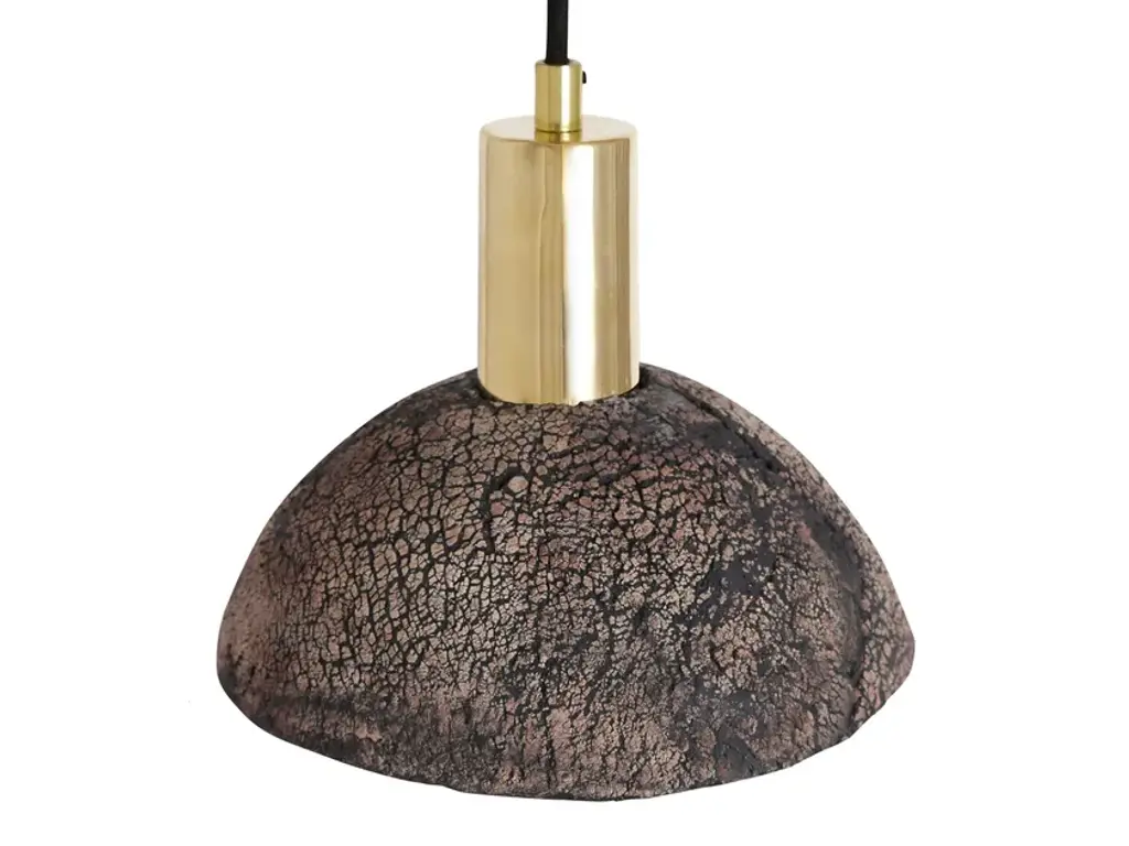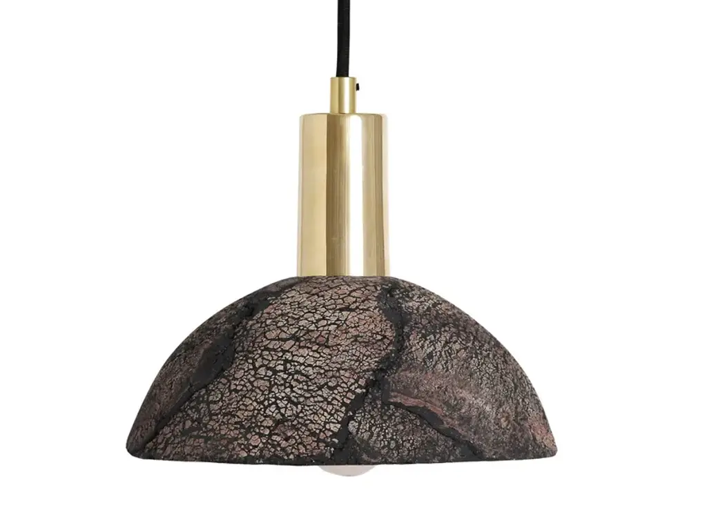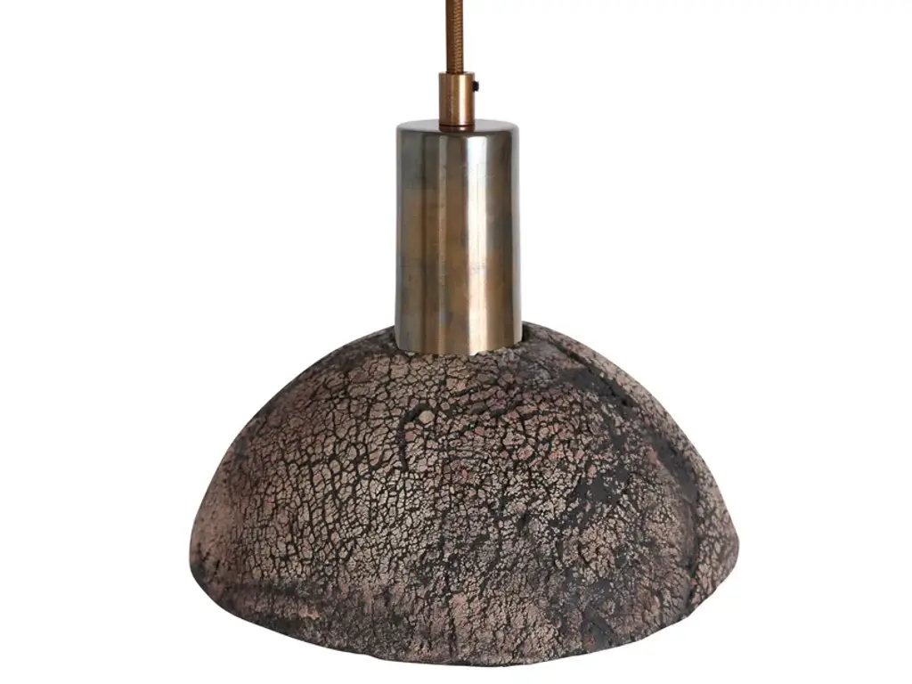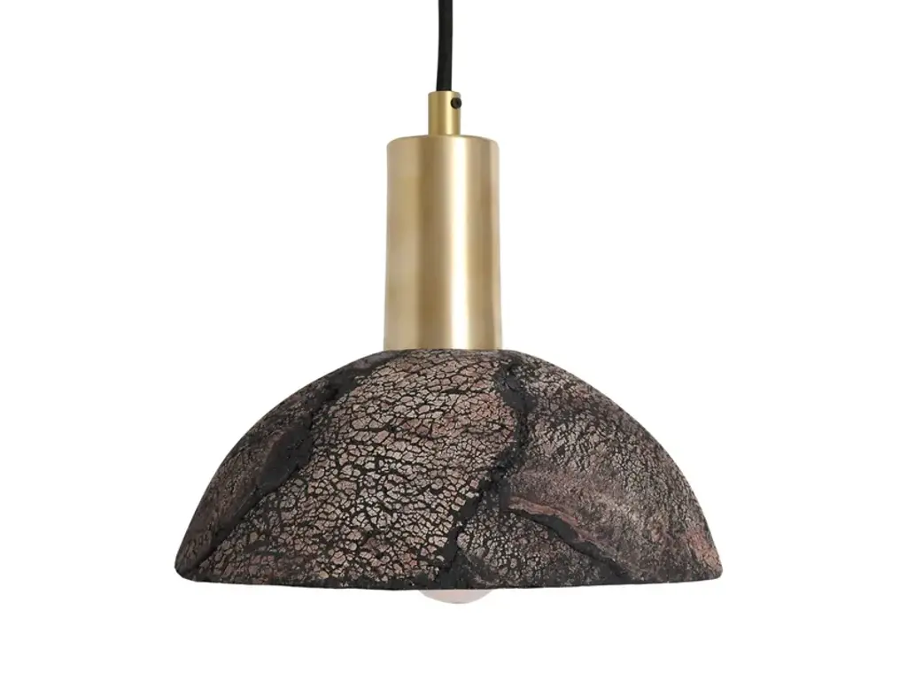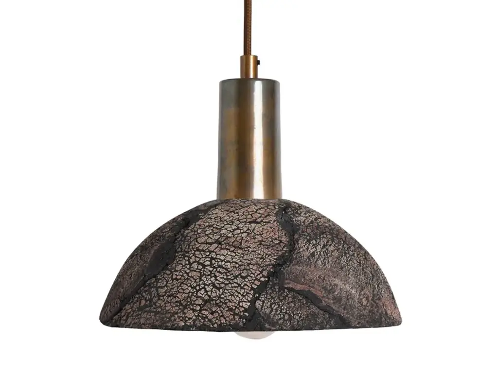 The Kauri tree originates from New Zealand and has influenced the naming of this intriguing ceramic pendant light. As the Kauri tree ages, it sheds low hanging branches and forms a crown-shaped façade, similar to the dome-shaped design of the Kauri ceramic pendant.The cracked engravings mirror the growth extension of a tree's roots, tying in the natural essence of the clay materials used to craft this peerless pendant. Completed in a Black Clay colour finish, this particular pigment is a soft blend of warm browns, greys and dark charcoals. With an inviting complexion, this multi-toned pendant is sure to bring a relaxed sensation to interior spaces.Supported by a tall brass lamp holder, the Kauri ceramic pendant blends with other interior furnishings by hosting the opportunity to choose from four distinct colour finishes: antique brass, antique silver, polished brass and satin brass.The dome-shaped pendant is a charming addition to interiors, adding a rustic flair to kitchens and living spaces. At just 20cm in diameter, this pendant is perfect for small snug spaces or can be scattered across a kitchen island using two or three pendants. An adaptable design, the Kauri looks at home in country, vintage-style settings or alternatively comes to life in more modern industrial interiors.The coarse, textured pendant ceramic shade showcases the hours of craftsmanship spent on creating a unique, organic design that is reflective of the centuries old ceramic craft.SPECIFICATIONSProduct Weight: 1.1 kg / 2.4 lbLight Bulb Base: E27CE Approved: YesCeiling Rose: MLROSE39 | 12cm DiameterCeramic Shade Code: MLCS001IP Rating: IP20Lampholder: E27 | Plastic | ES | Edison ScrewMaterial: Brass, CeramicMax Wattage: 40wNumber of Bulbs Required: 1Protection Class: Class IStandard Cable/Chain Length: 100 cmVoltage: 110v/120v or 220v/240v (depending on delivery location)