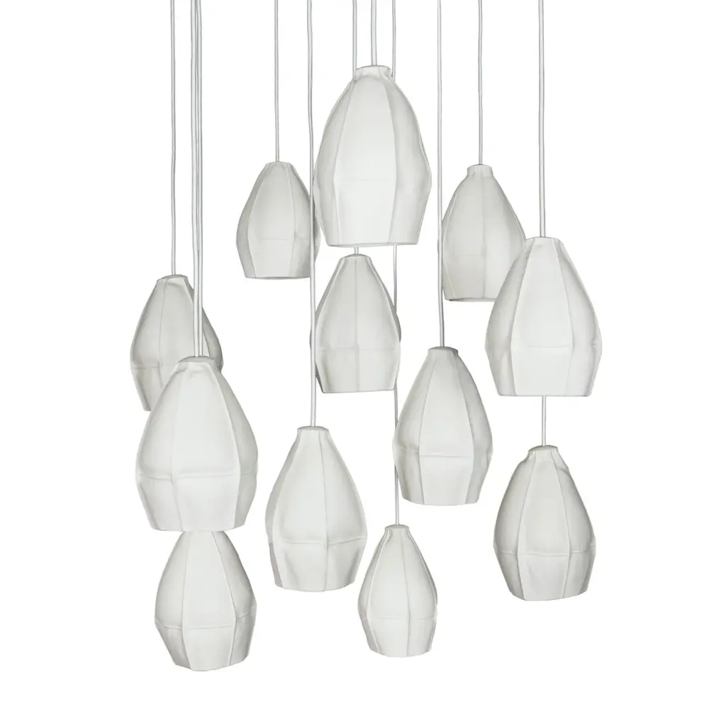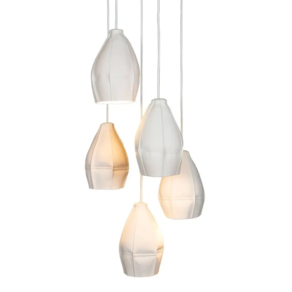 Souda's Kawa Pendant Lights are slip cast porcelain directly into dozens of leather molds resulting in highly-unique ceramic shades. The finalized pendant lights are dynamic and highly-unusual, emitting a soft glow that works well individually or in clusters.This listing includes five ceramic diffusers, their accompanying electrical sockets and one circular 22" white canopy for wiring the fixtures. We can alternatively provided five small canopies if you'd prefer to individually wire each pendant.Measures: Single diffuser size W 6.75" x L 6.75" x H 9" / W 17cm x L 17cm x H 23cm.Canopy Size W 22" x L 22" x H 1.5" / W 56cm x L 56cm x H 4cm.Lamping: 1 e26 medium base socket per diffuser, five total.Dimmable?: yes, depending on the type of bulbCord length: 96in / 240cmCanopy size: 22" D x 1.5" H / 56cm D x 3.5cm H.Canopy color: White.Recommended bulb type: CFL or LED.Max watt: 25w per socketUL Listed.