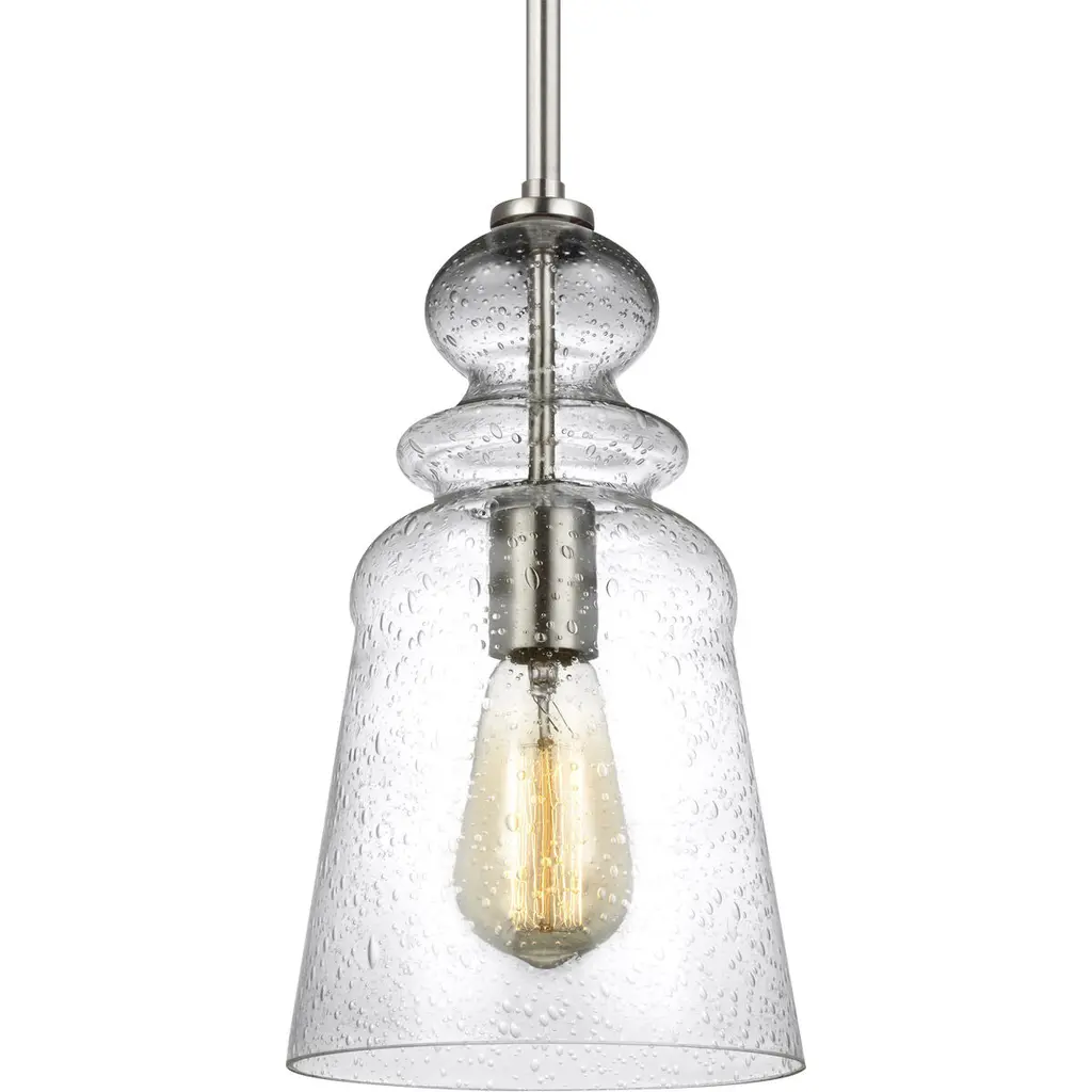 The Kea one light indoor pendant in brushed nickel supplies ample lighting for your daily needs, while adding a layer of today's style to your home's d?cor. Inspired by the stacked modern elements of items found in Parisian boutiques, the silhouette of the Kea Collection by offer a signature focal point with a single lamp suspends downward from the center. A hint of Brushed Nickel or Heirloom Bronze peeks through the Clear Seeded glass becoming a central design element of the fixture. Kea pendants may be installed as single pendants or clustered in multiples, which would be an ideal installation used for entry lighting, dining room lighting, living room lighting or kitchen lighting over a table. Fixtures are California Title 24 compliant and easily convert to LED by purchasing LED lamps sold separately.