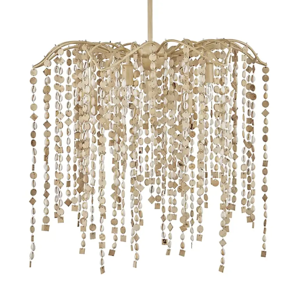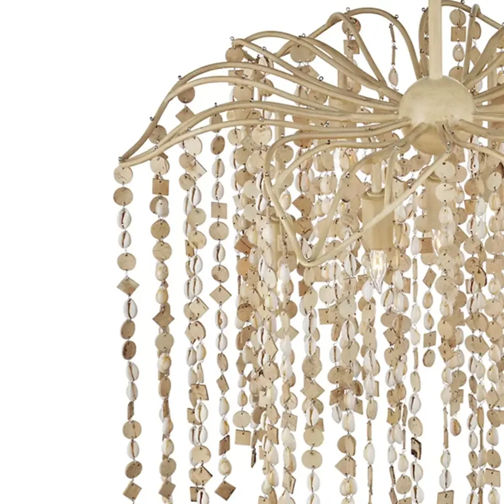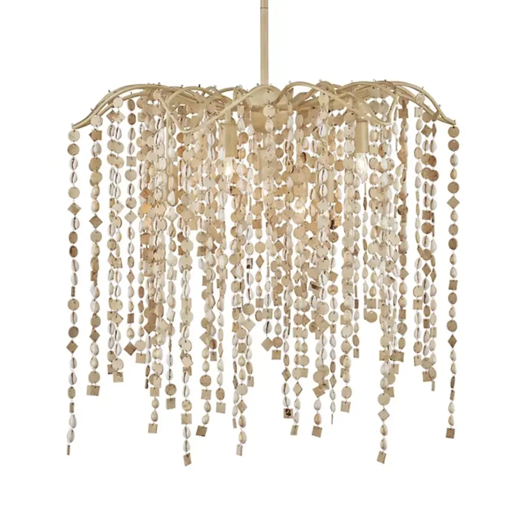 The Kealia Pendant from Currey & Company arranges hand-beaded cowrie shells and coconut shell accents in cascading strands that hang from a curved wrought iron frame. Natural materials form curtain-like layers around ten internal light sources, producing patterned illumination that shifts as air moves through the space. The frame's slender ribs follow botanical-inspired curves while supporting the weight of hundreds of individual shell pieces. This ten-light fixture embodies biophilic design principles, bringing the organic textures and earth-derived materials of nature indoors to bridge interior spaces with its inherent beauty and calming influence.