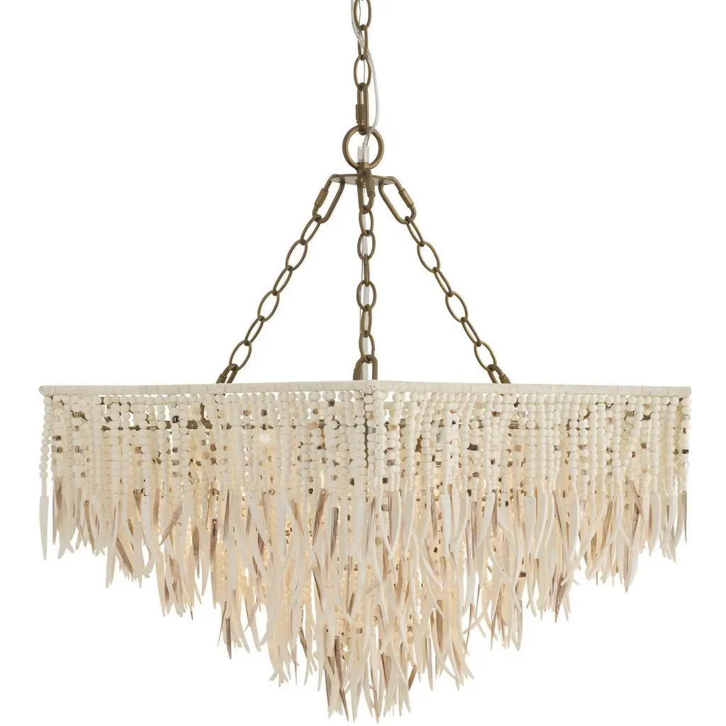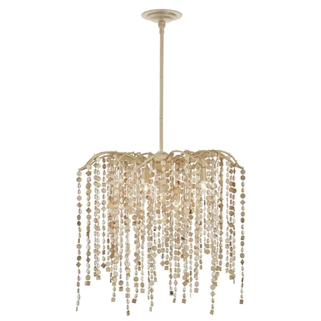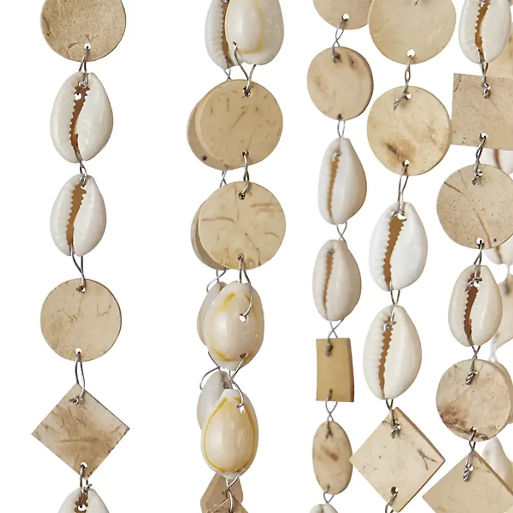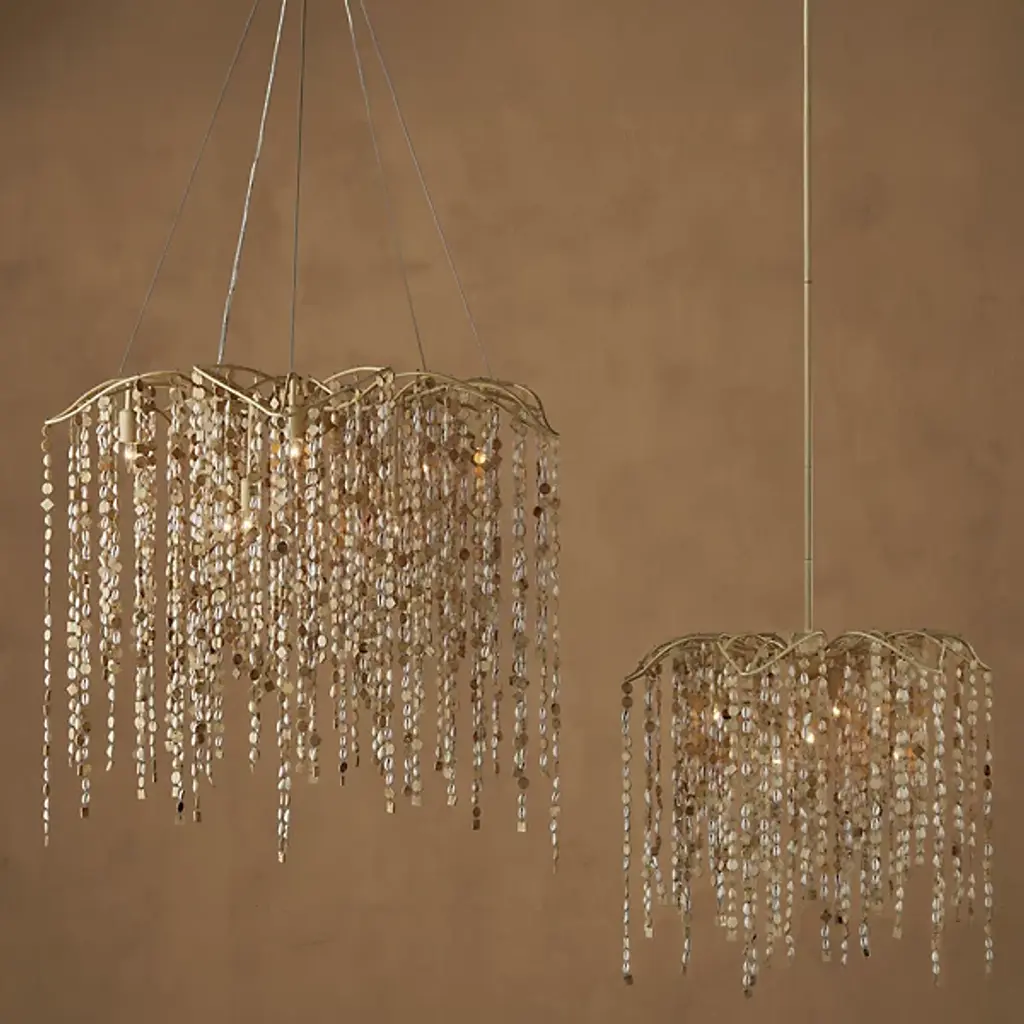 The Kealia Pendant from Currey & Company arranges hand-beaded cowrie shells and coconut shell accents in cascading strands that hang from a curved wrought iron frame. Natural materials form curtain-like layers around ten internal light sources, producing patterned illumination that shifts as air moves through the space. The frame's slender ribs follow botanical-inspired curves while supporting the weight of hundreds of individual shell pieces. This ten-light fixture embodies biophilic design principles, bringing the organic textures and earth-derived materials of nature indoors to bridge interior spaces with its inherent beauty and calming influence.