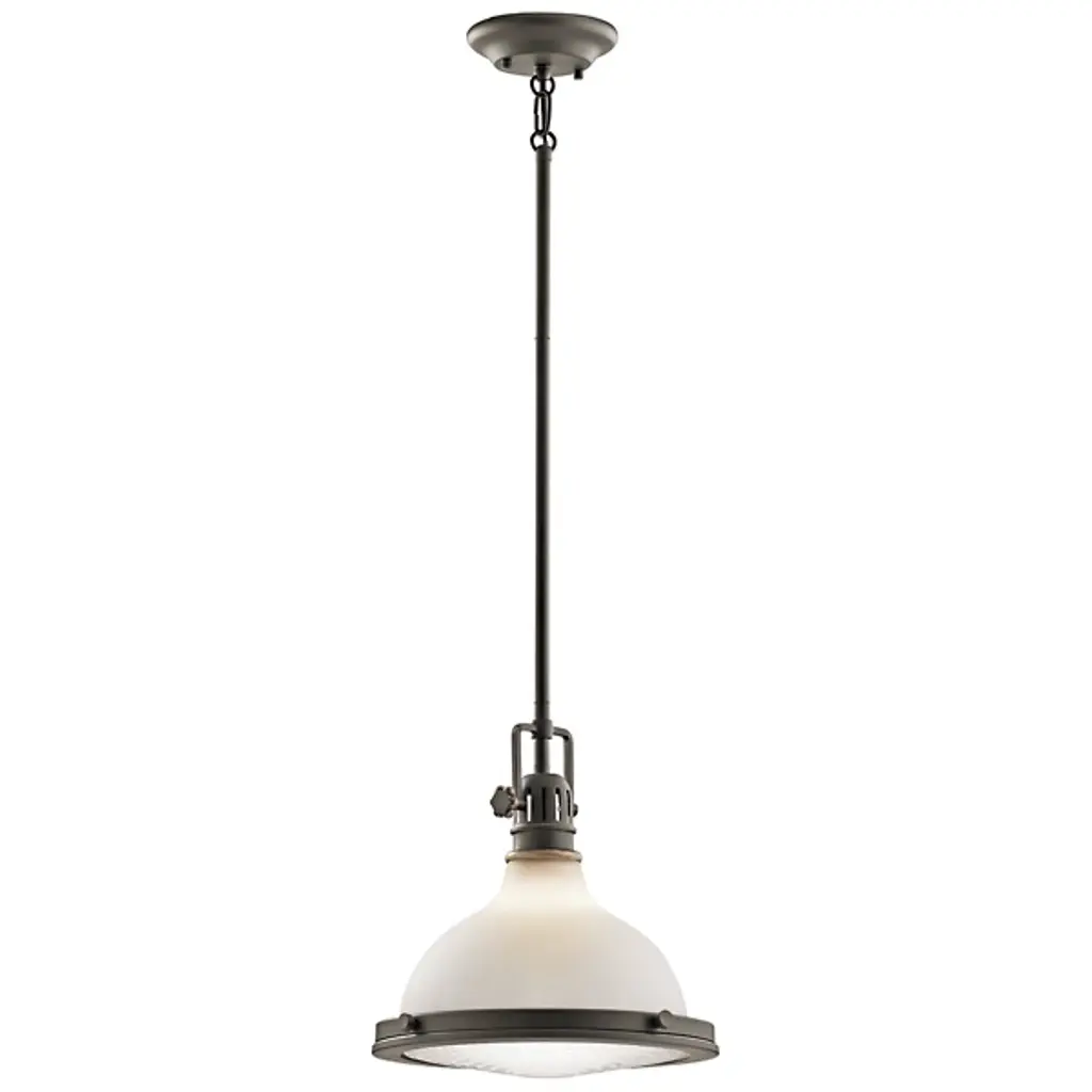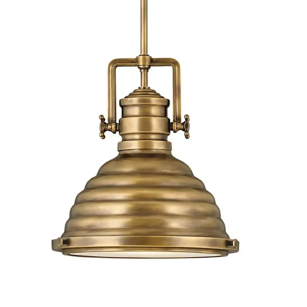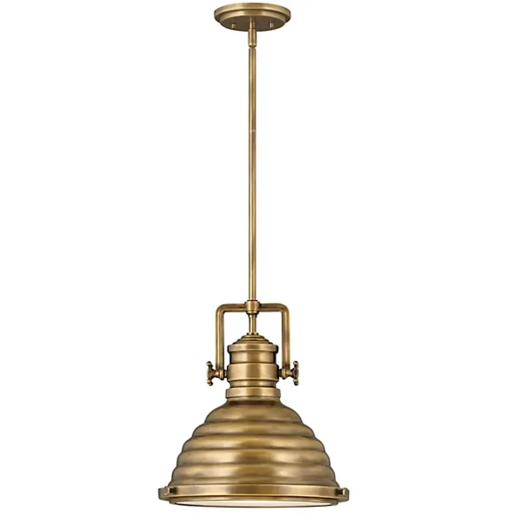 The Keating Pendant by Hinkley Lighting brings a turn of the century factory feel to your modern living space. Intricate lines detail the entire piece, from the ceiling mount and downrod to the spotlight-shaped body. Sharp angles and grooved indentations make up a false handle connected to the body, like a once-mobile fixture repurposed for your home. The smooth, curved body provides a sense of elegant mobility and the ability to hang it on a sloped ceiling makes it a versatile option for ambient lighting needs.