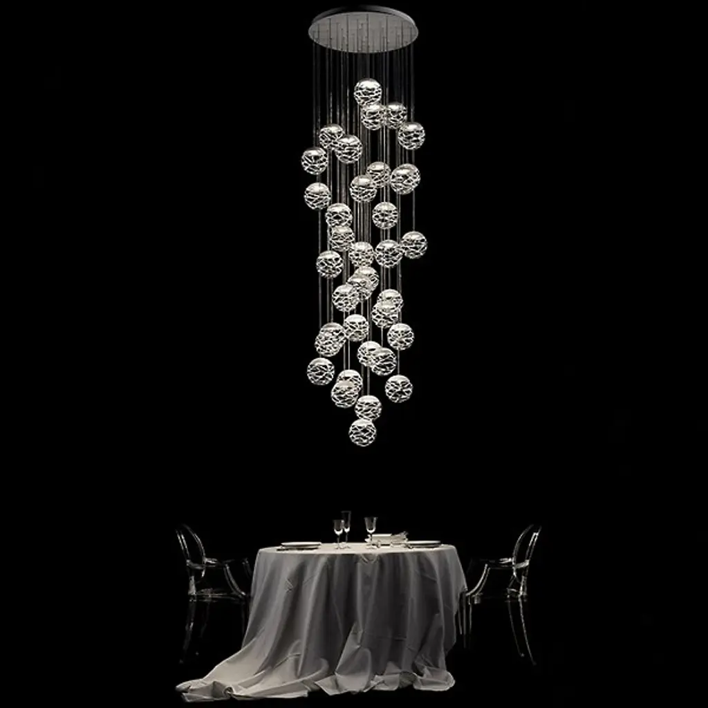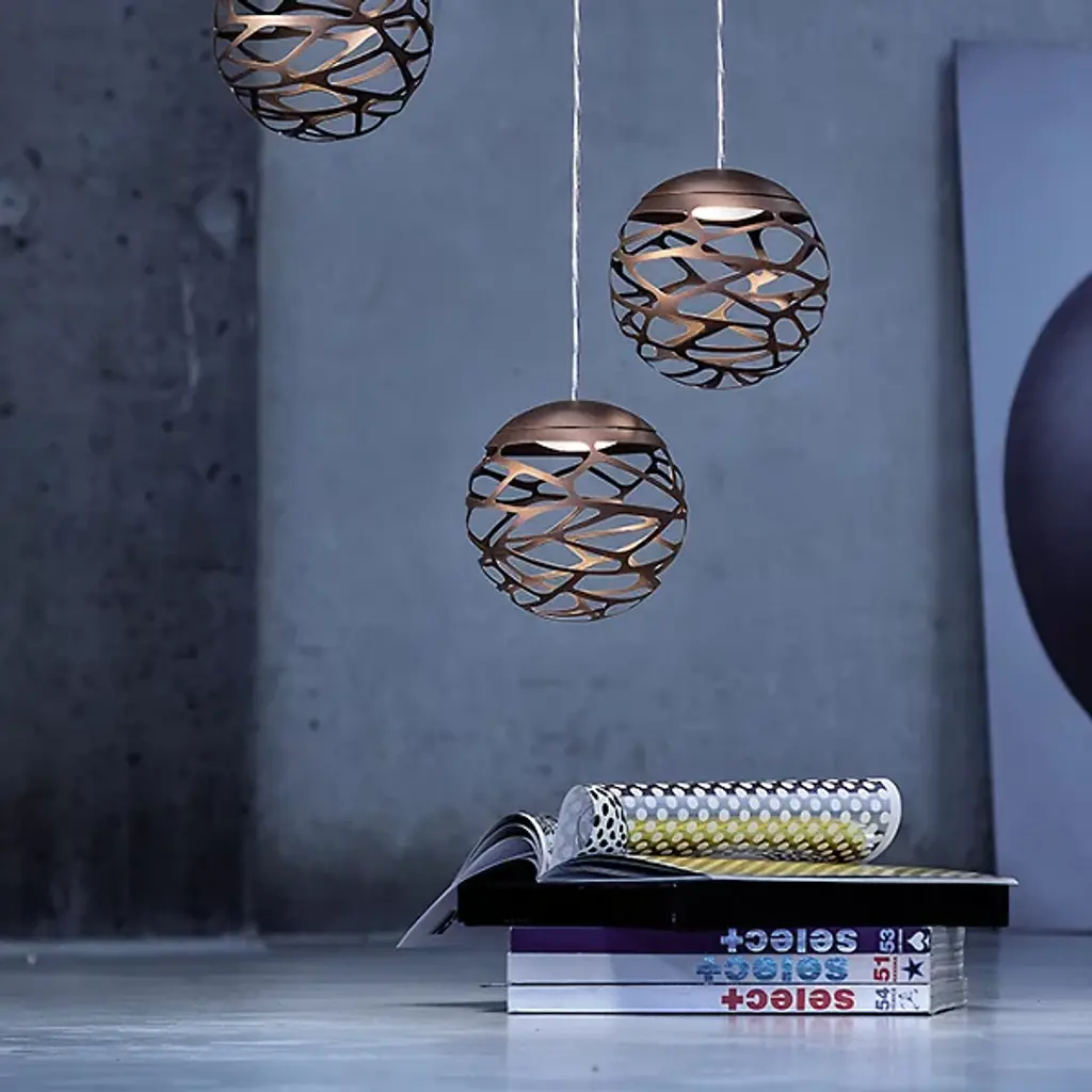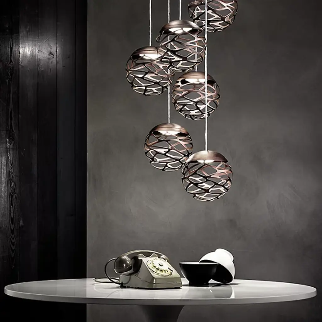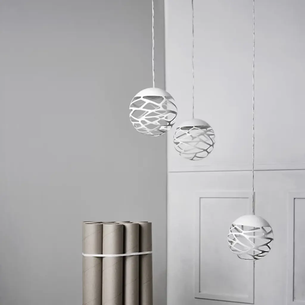 The LODES Kelly Cluster LED Pendant will surely make a statement with cascading orbs elegantly cut and primed for bright illumination. The original Kelly Sphere Pendant is scaled down and multiplied, retaining the same delicate laser cut pattern that populates each metal shell. At the apex of each pendant a white glass diffuser shields the LED light sources, shining uniform down light below. By staggering the pendants at varying lengths further light effects can be achieved, and given a maximum hanging length, there is room for customization.