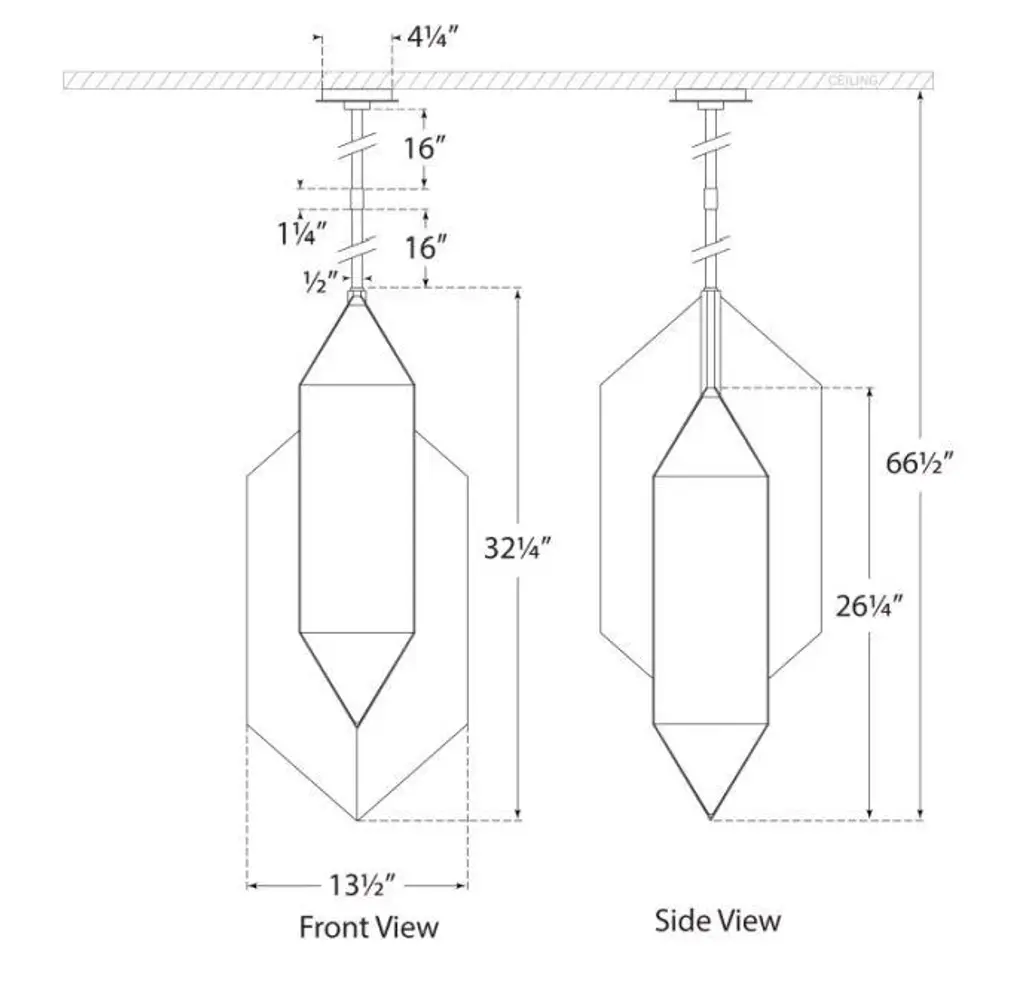 Ophelion Medium Pendant in Polished Nickel with Alabaster Designer: Kelly Wearstler Fixture Height: 32.25" Min. Custom Height: 39" O/A Height: 66.5" Canopy: 4.25" Square Mounting: Rod Shade Detail: Alabaster Socket: Dedicated LED Wattage: 72w (6000lm) Safety Rating Location: Dry Note: Custom Height Available