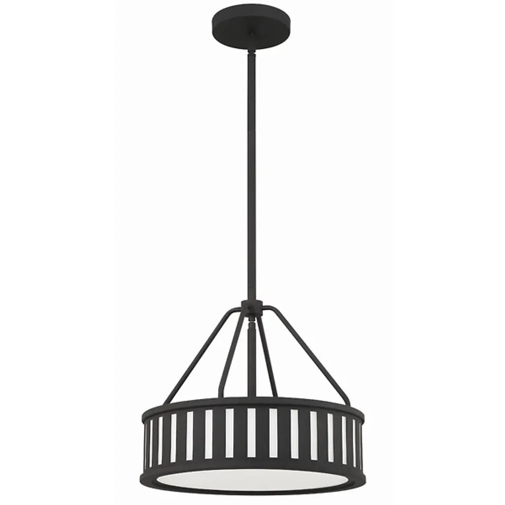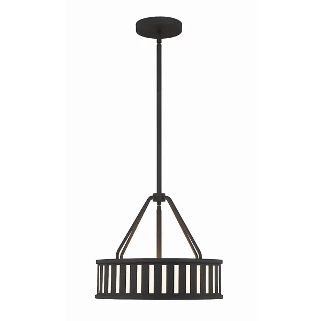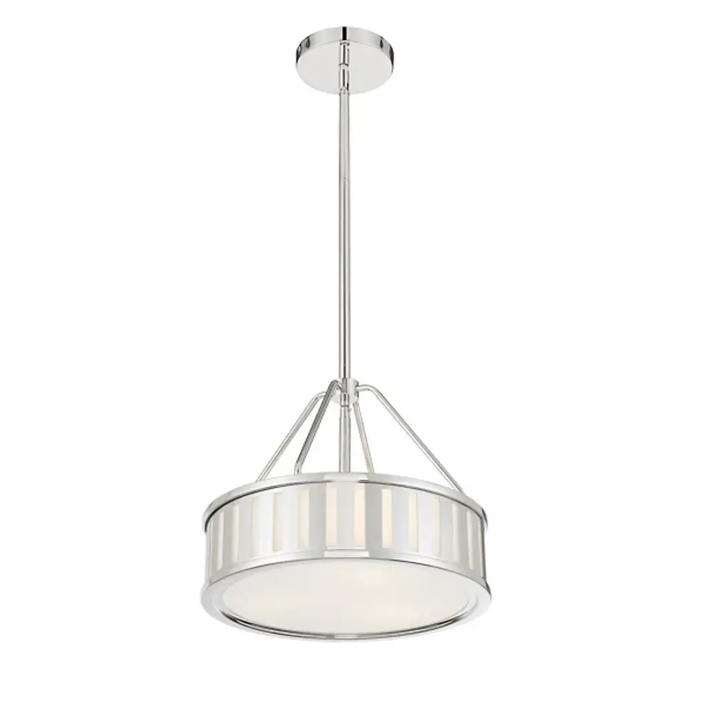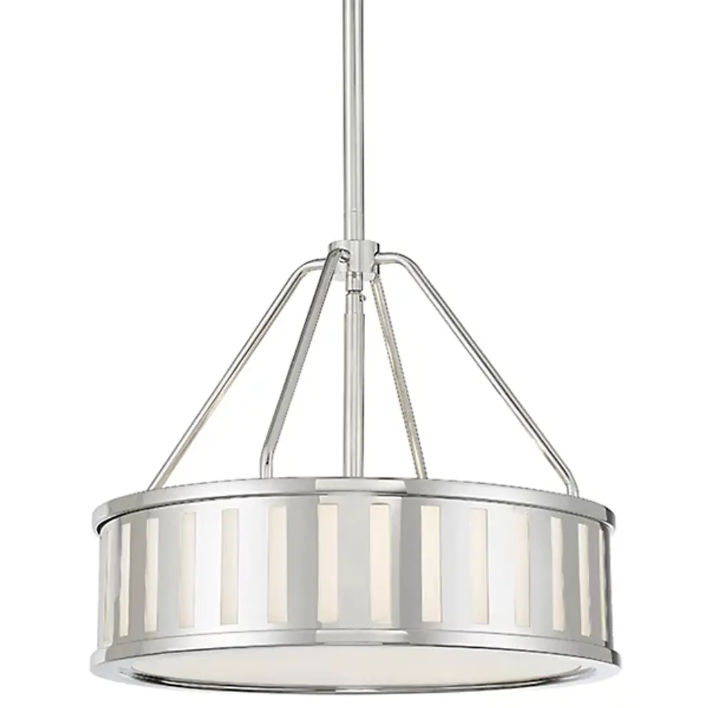 The Kendal Chandelier makes a statement with its graphic, uniform silhouette. The metal framing elegantly surrounds the white glass in this drum-shaped chandelier. This luxurious luminary's clean shapes are a great choice in industrial, modern, and rustic settings. Display the Kendal as a solo piece or in multiples to complete your lighting design vision.