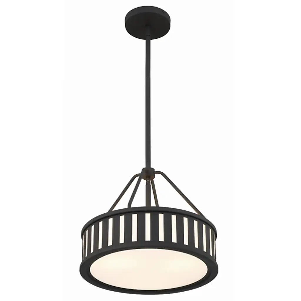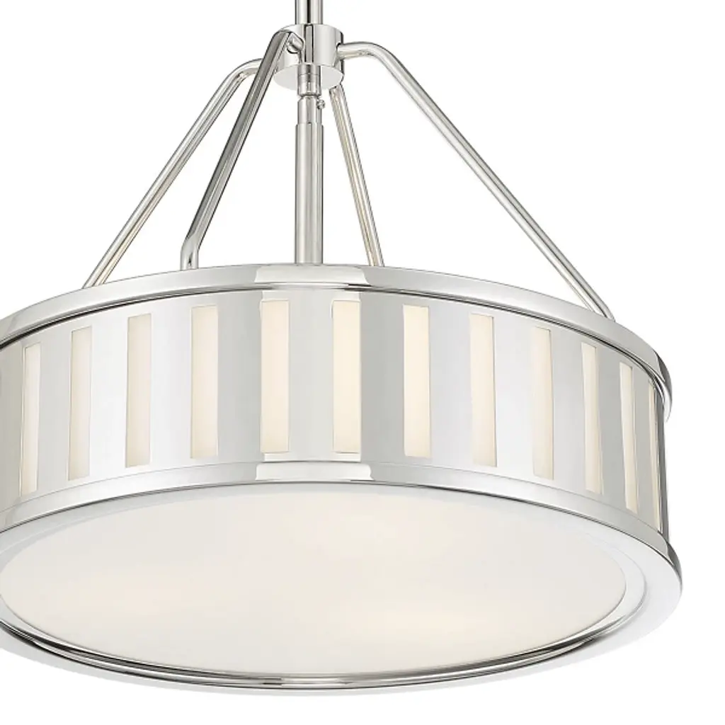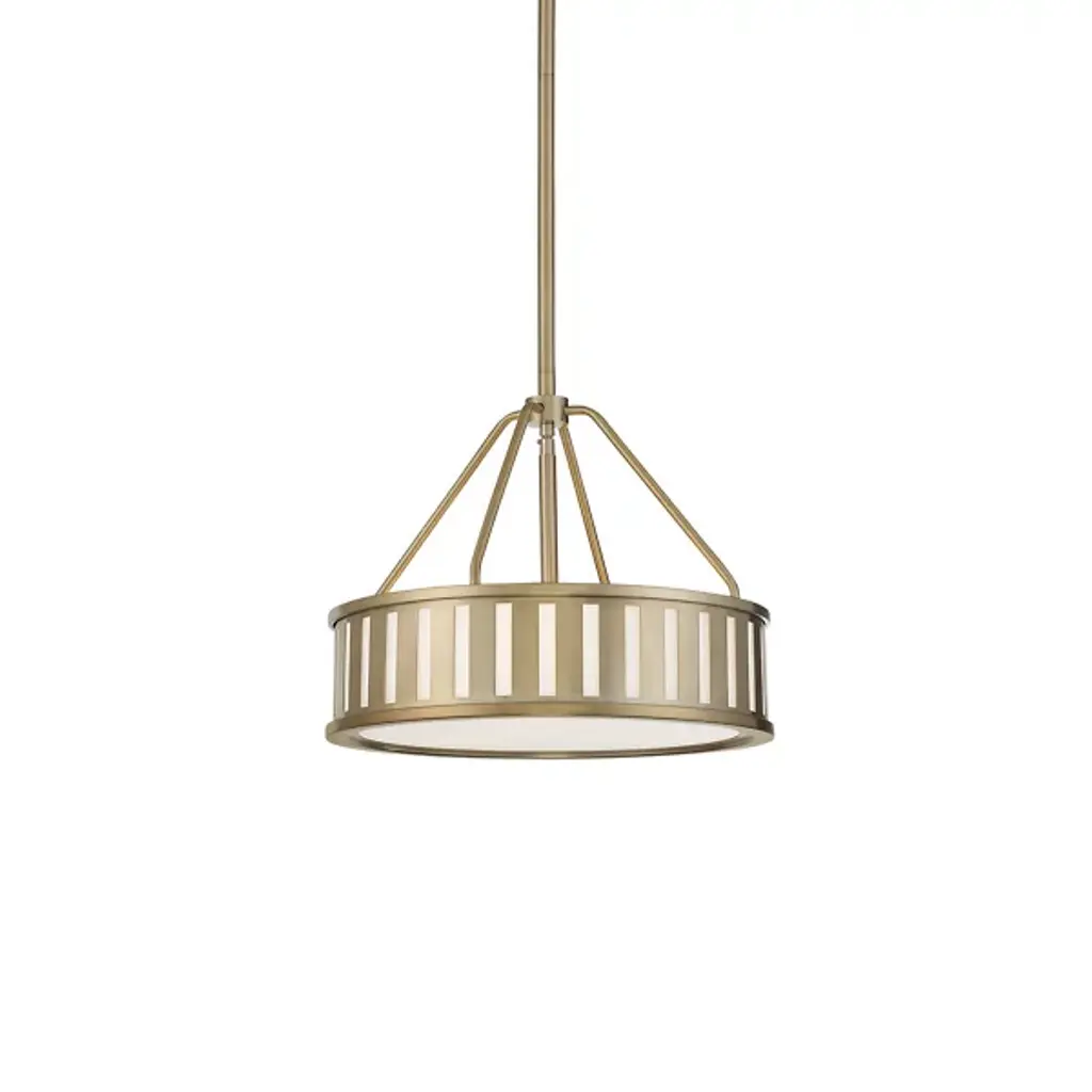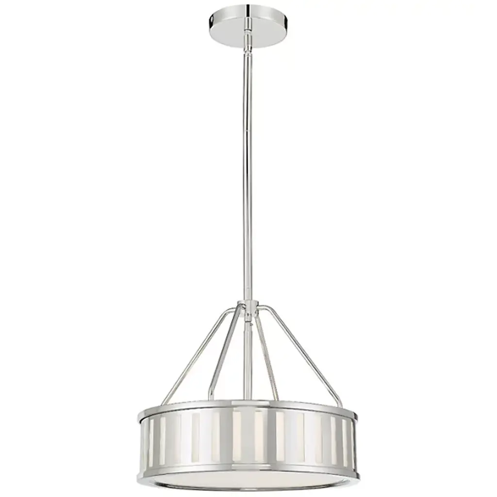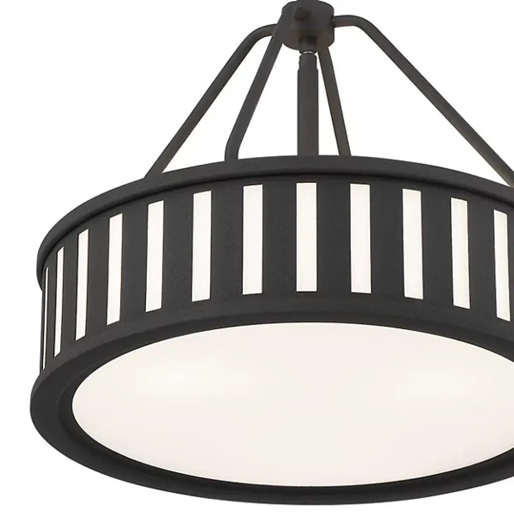 The Kendal Chandelier makes a statement with its graphic, uniform silhouette. The metal framing elegantly surrounds the white glass in this drum-shaped chandelier. This luxurious luminary's clean shapes are a great choice in industrial, modern, and rustic settings. Display the Kendal as a solo piece or in multiples to complete your lighting design vision.