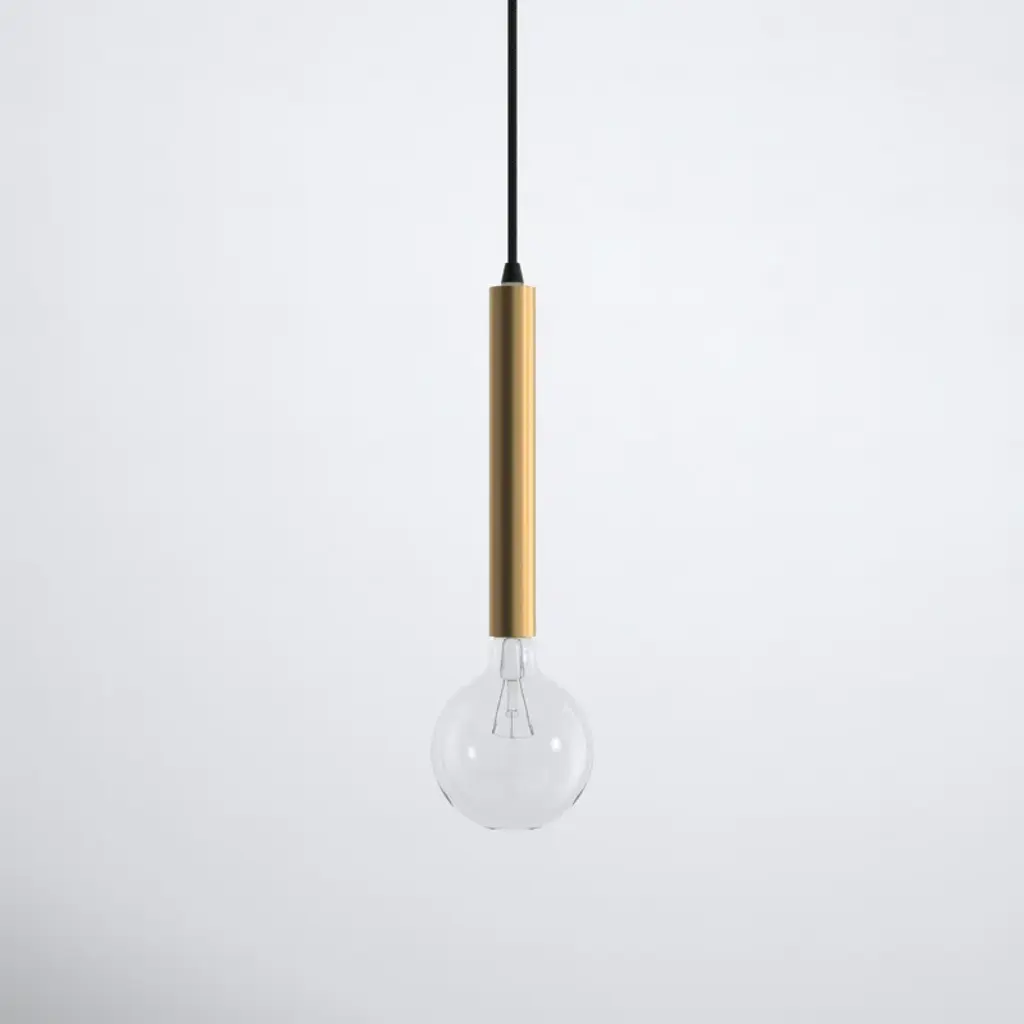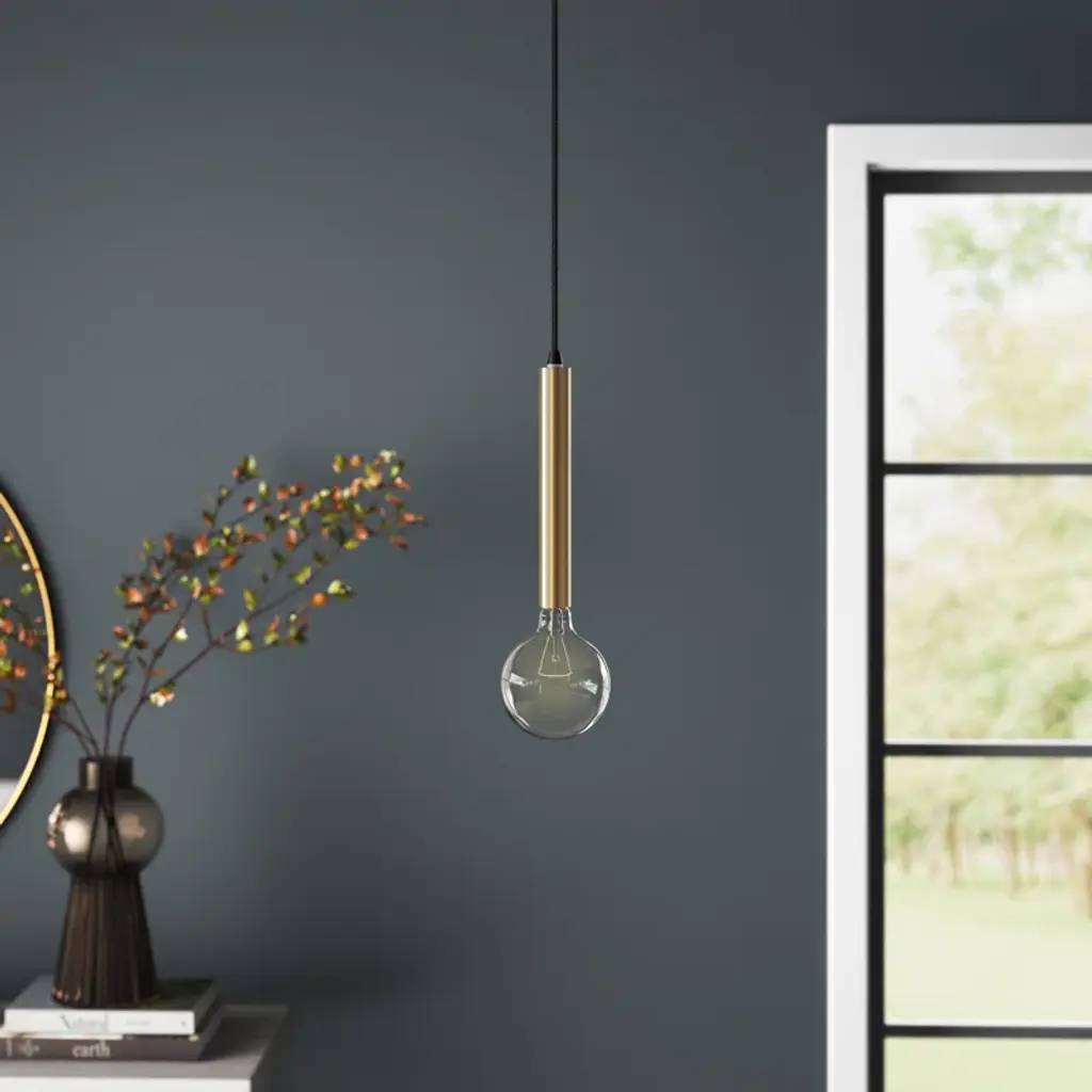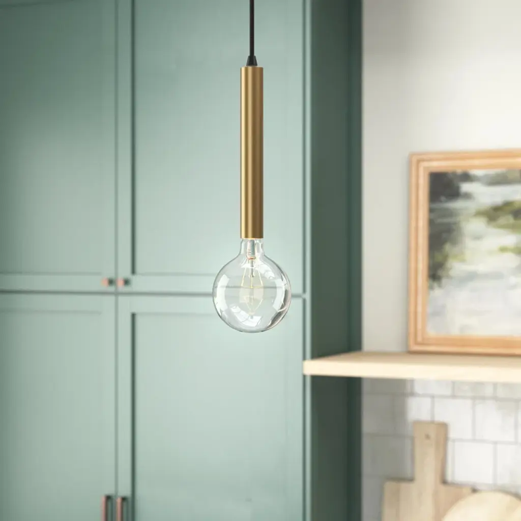 Mingling mid-century modern design elements into its posh form, Kenia merges a playful vibe with stellar style. This clever design pairs two bold finishes, gleaming lacquered brass and an intense black, to set up the true star of the show: a look-at-me bulb that makes lighting what it should be fun. To complement Kenia's confident style, we recommend a G40 oversized globe-styled bulb in a standard medium base.