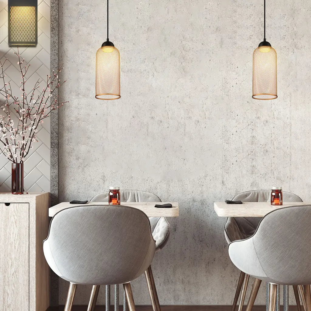 A delicate mesh shade hangs from a single rod, shaping dazzling light patterns across your walls. Quietly unwind with added cozy ambience thanks to its retro design elements and rich finishes.