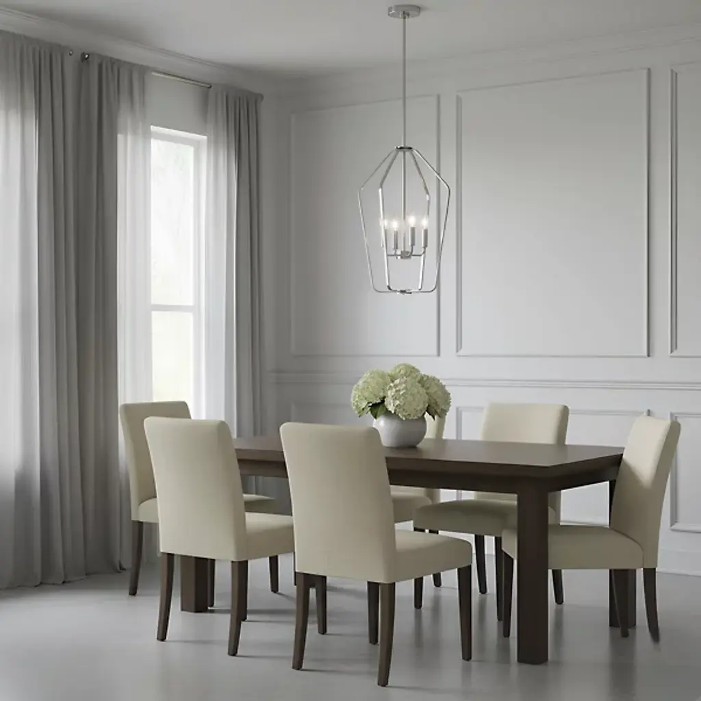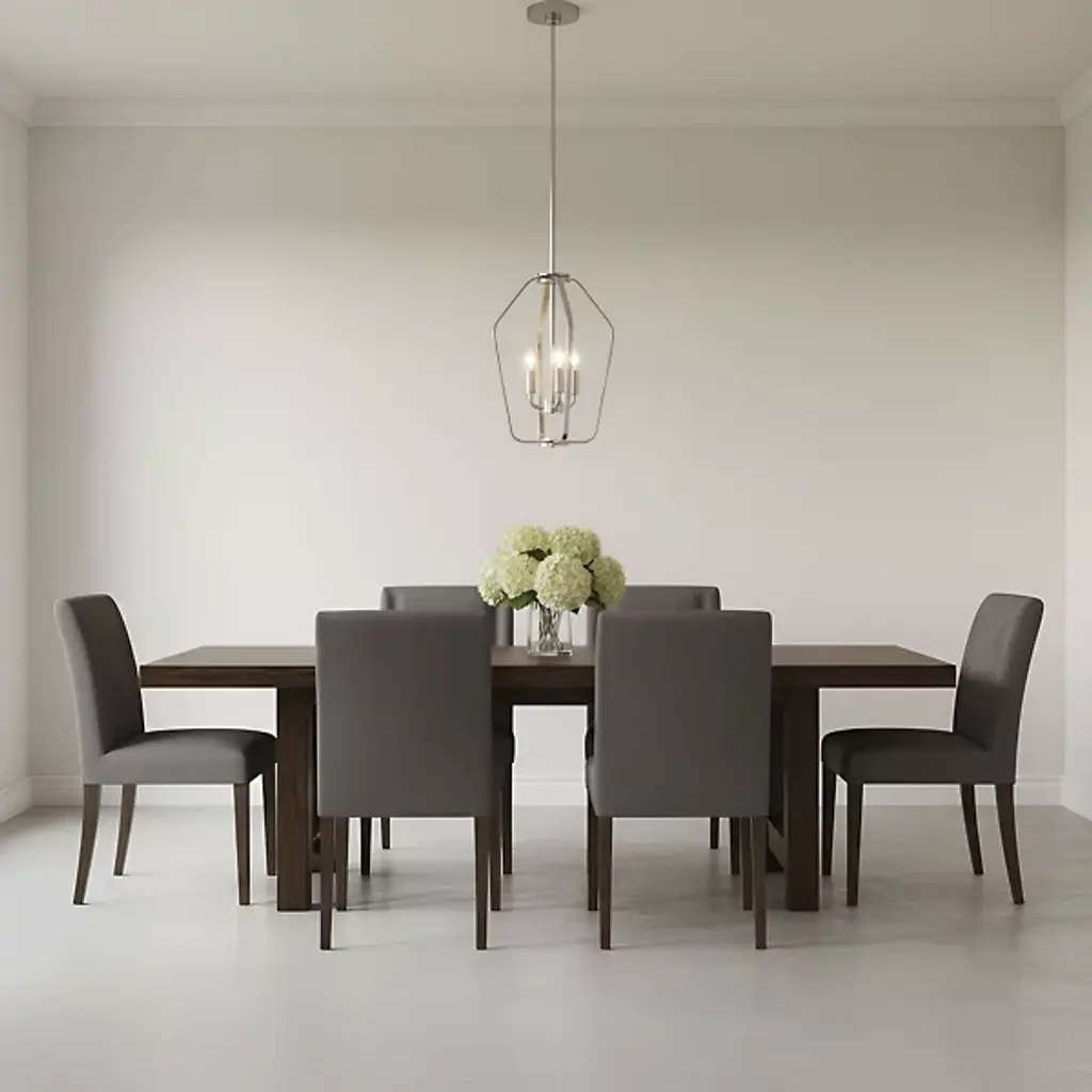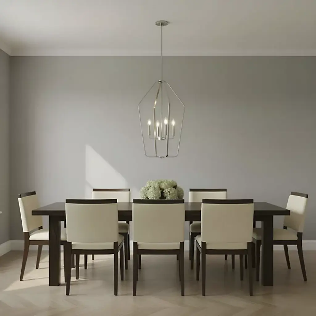 The Kennan Pendant from Generation Lighting reinterprets traditional lantern forms through clean geometric lines and substantial scale that emphasizes volume over ornamentation. The open metal framework houses exposed candelabra sockets without glass enclosures, allowing the bulb forms and optional candle sleeves to become prominent design elements. This modern lantern approach relies on structural presence rather than decorative details to create visual impact. The pendant can accommodate sloped ceiling installations and works well with clear bulbs that complement the fixture's minimalist lantern aesthetic.