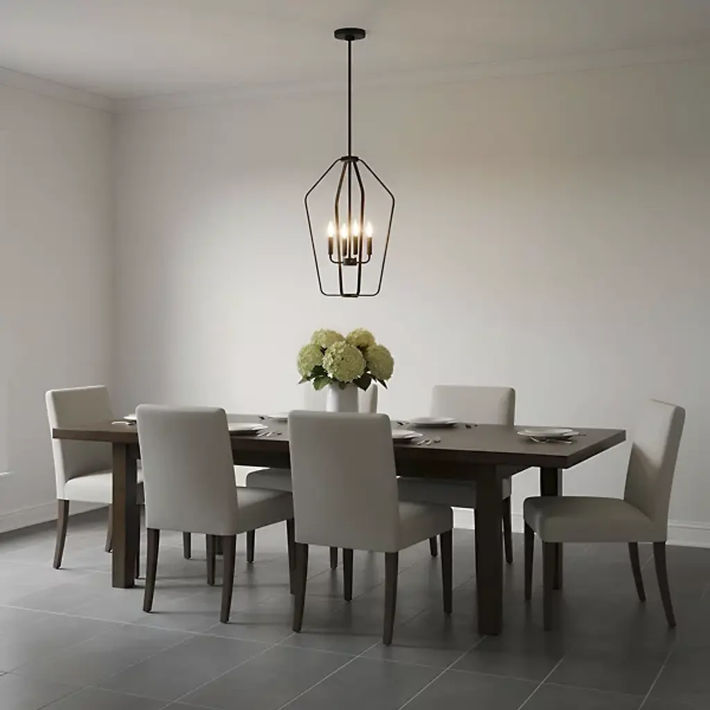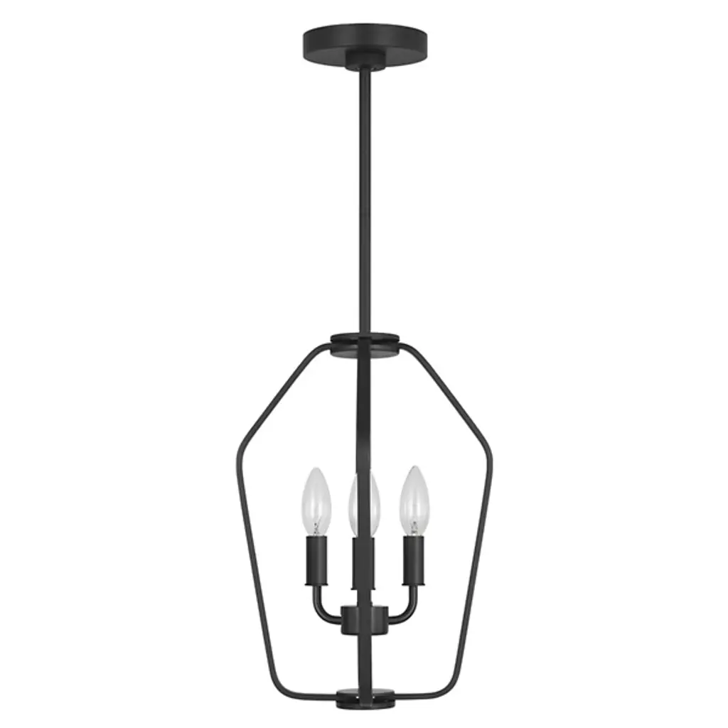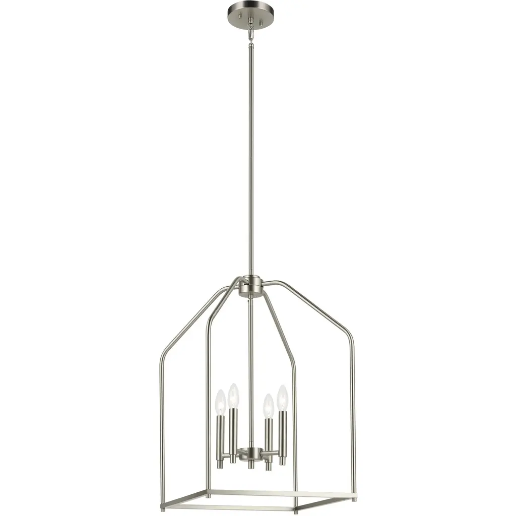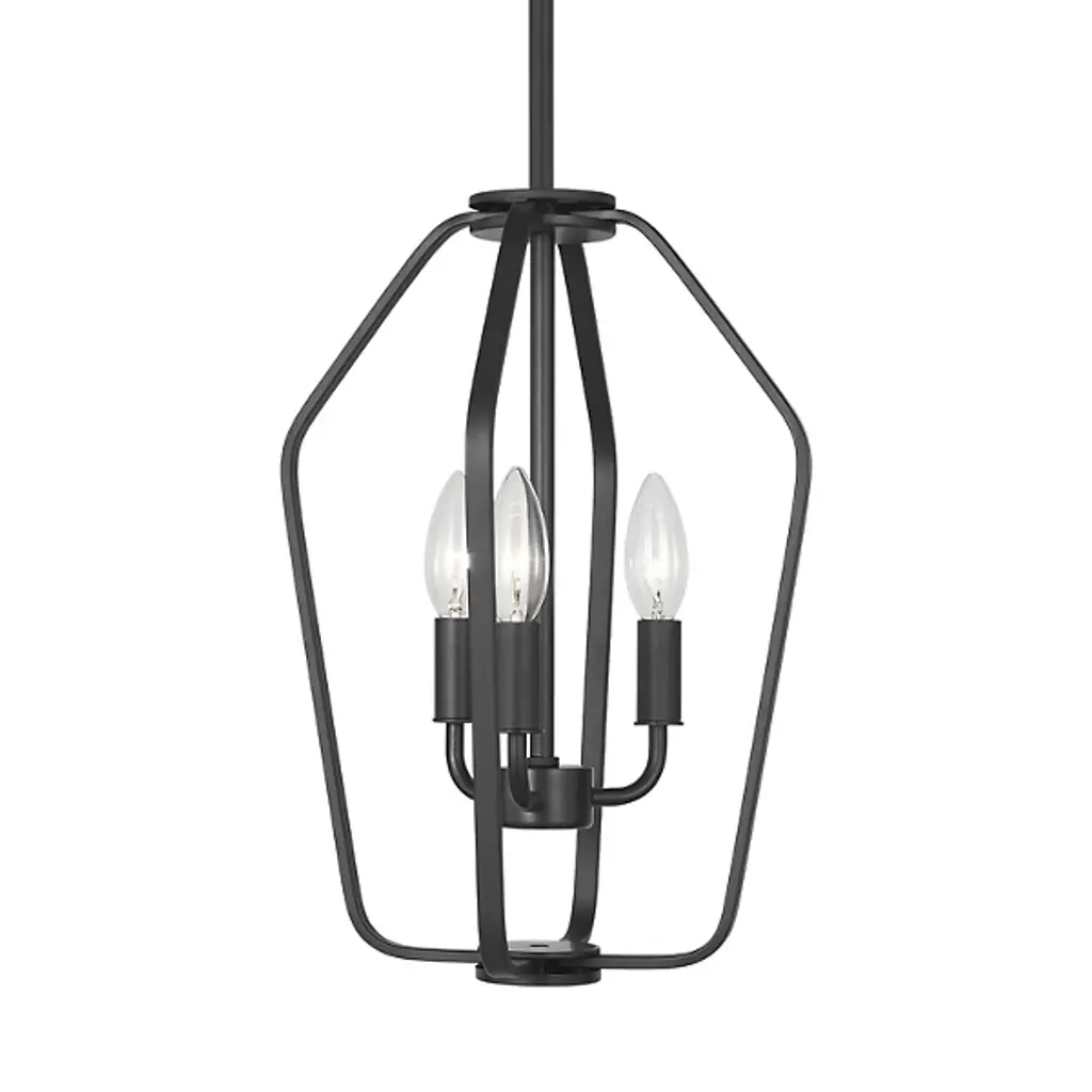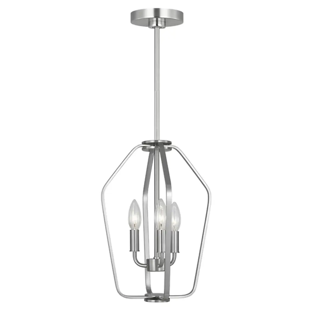 The Kennan Pendant from Generation Lighting reinterprets traditional lantern forms through clean geometric lines and substantial scale that emphasizes volume over ornamentation. The open metal framework houses exposed candelabra sockets without glass enclosures, allowing the bulb forms and optional candle sleeves to become prominent design elements. This modern lantern approach relies on structural presence rather than decorative details to create visual impact. The pendant can accommodate sloped ceiling installations and works well with clear bulbs that complement the fixture's minimalist lantern aesthetic.