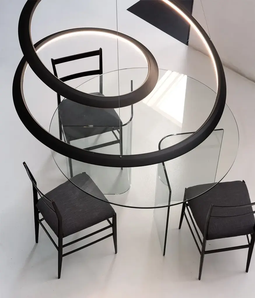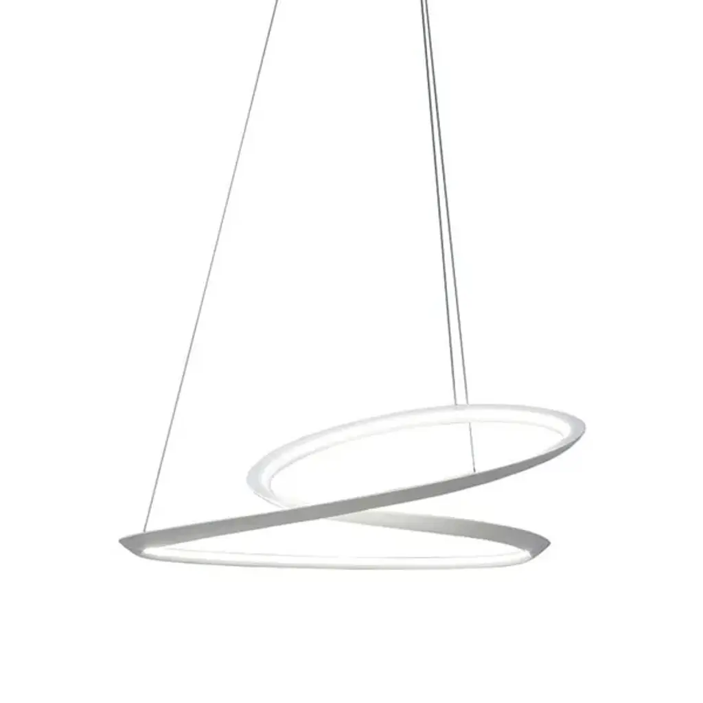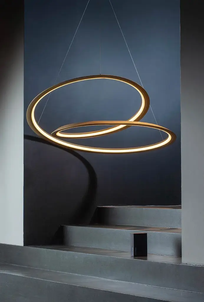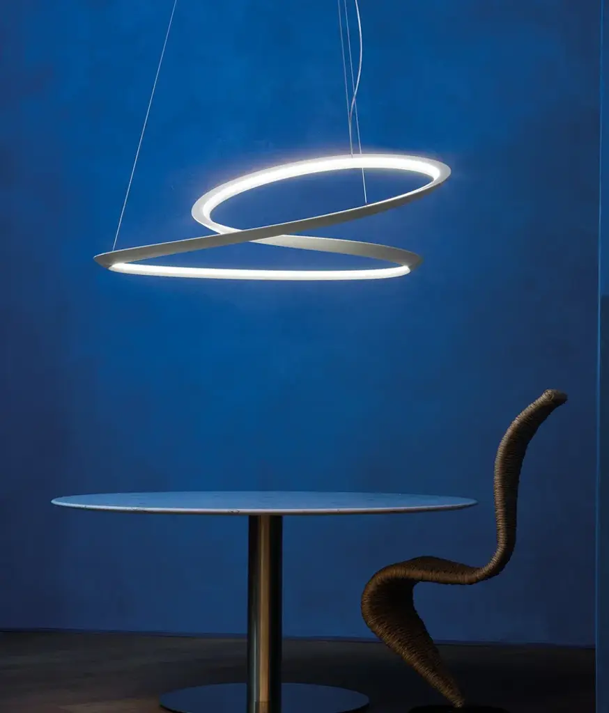 Pendant lamps available in two sizes Kepler e Kepler Minor.The structure is a painted aluminum extrusion, whose continuous line is made through a three-dimensional machining process engineered by Nemo and designed on the basis of the geometric principle of the Moebius strip.Available in “up” versions with upward light source and downward “down” versions in matt white, black and gold painted finishes.DOWNLIGHT 2700K/3000KUPLIGHT 2700K/3000K