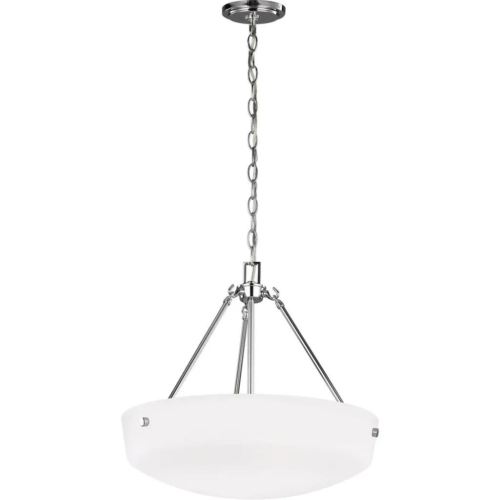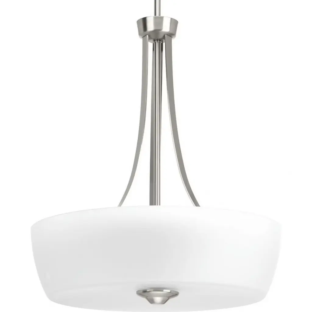 The Kerrville three light indoor pendant in brushed nickel is an ENERGY STAR½ qualified lighting fixture that uses LED bulbs to save you both time and money. With a simple, airy appearance, the Kerrville lighting collection by embraces its modern design roots while enhancing virtually any homes decor. Tubular steel arms extend outward and curve to present beautiful tapered, Satin Etched glass shades. The collection has a Brushed Nickel, Burnt Sienna or Chrome finish and offers three-, five- and nine-light chandeliers, a one-light mini pendant, one- and three-light pendants, a two-light semi-flush mount which can convert to a pendant, and one-, two-, three- and four-light bath fixtures. Incandescent and ENERGY STAR-qualified LED lamping are available; all fixtures are California Title 24 compliant.