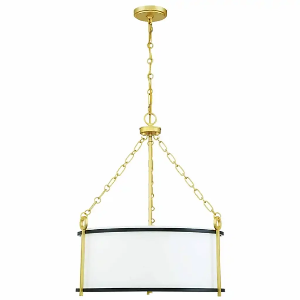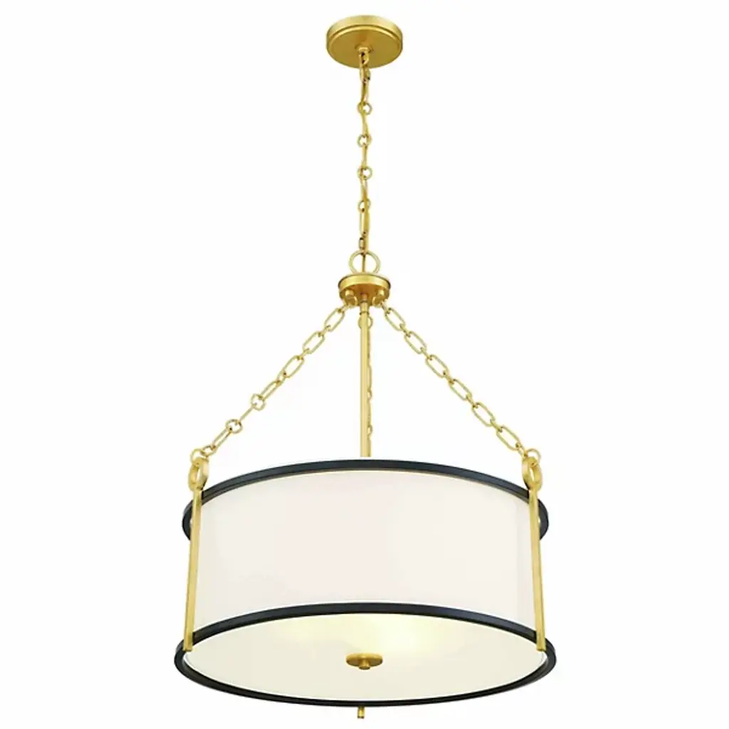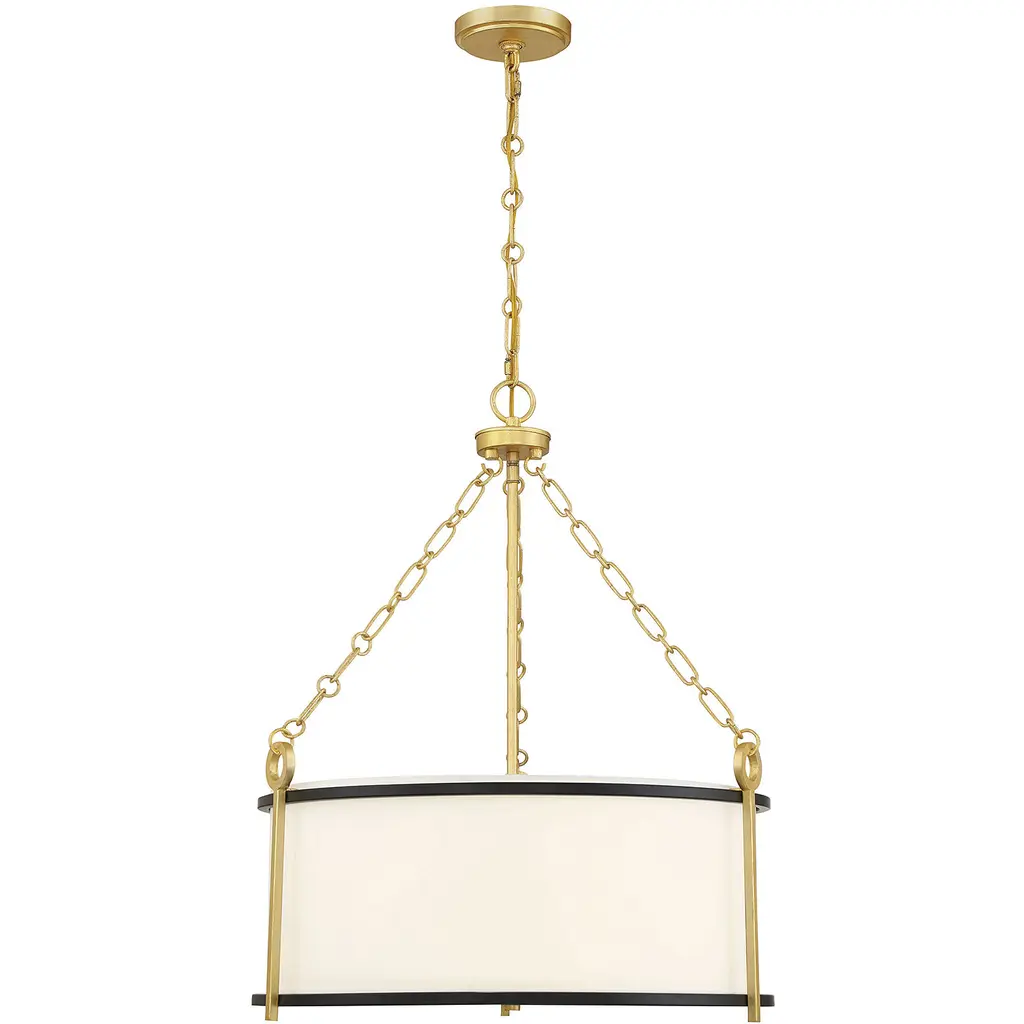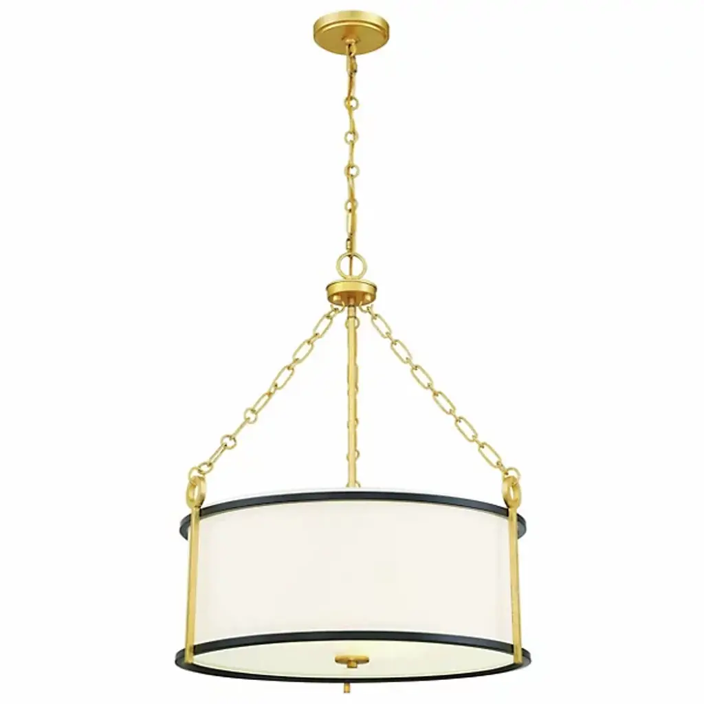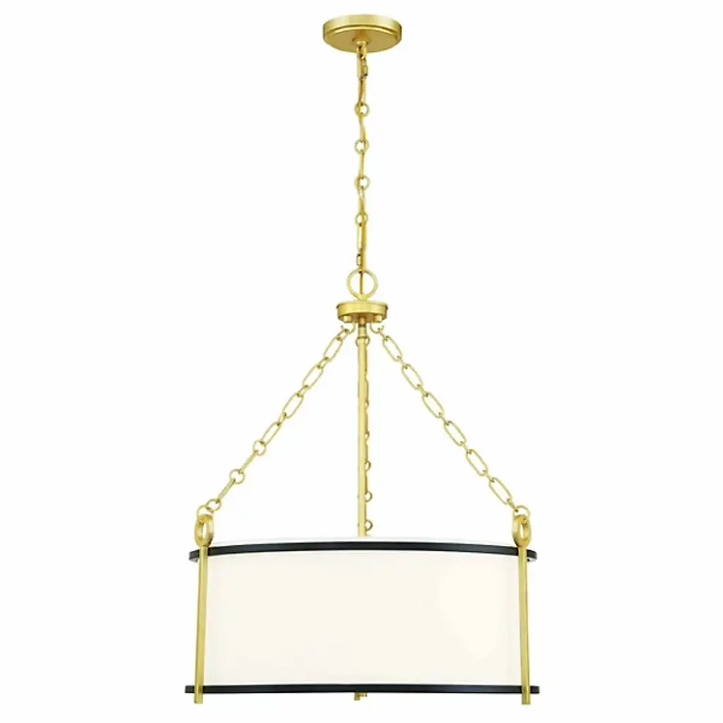 Elegantly composed with lovely contrasting details. The Kian Pendant is a transitional piece from Savoy House. The drum-like bodice of the pendant is made of white fabric with metallic banding in a matte black finish. Contrasting finishes of true gold can be seen along the chain link, stems, and canopy. Regardless of where you choose to place it, the Kian Pendant is a fine choice of illumination that possesses a heightened aesthetic.