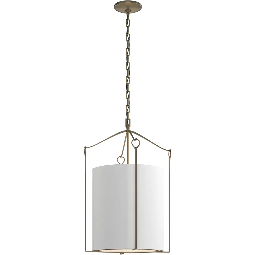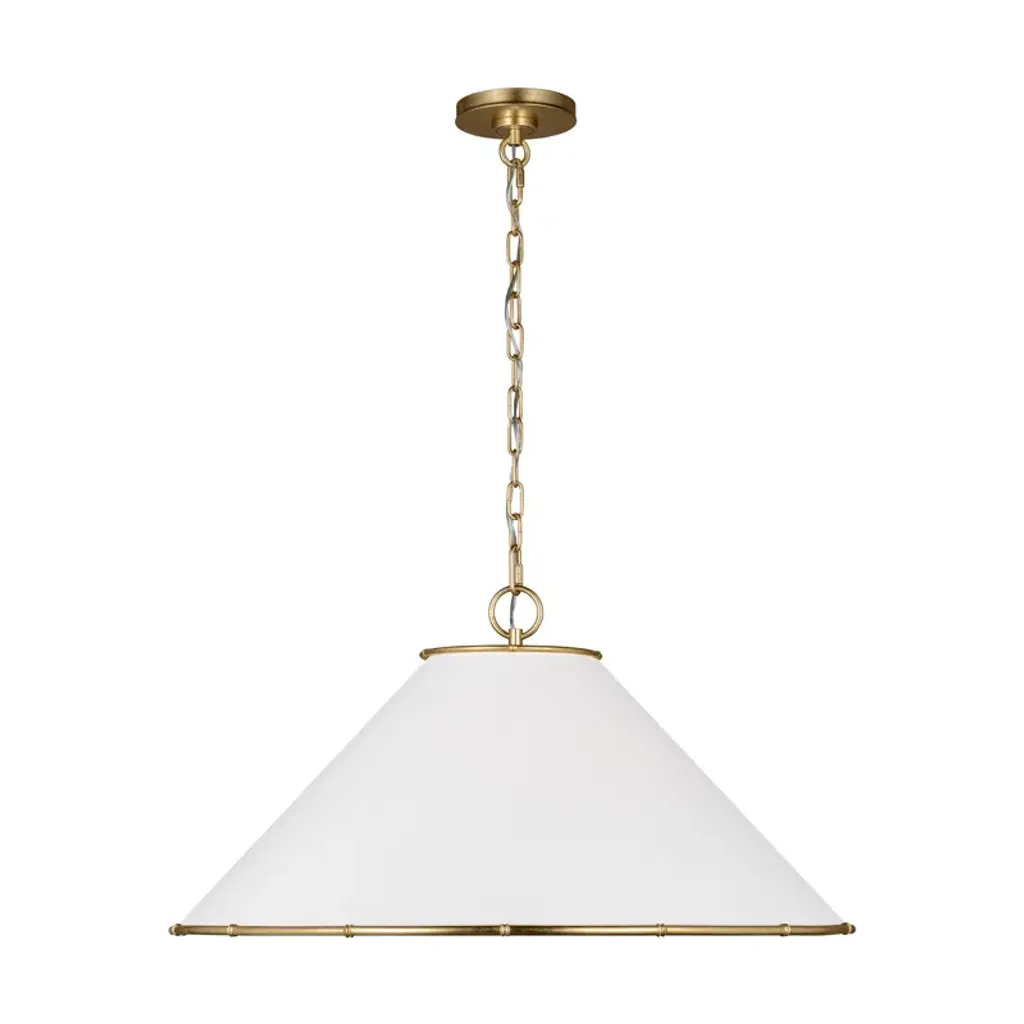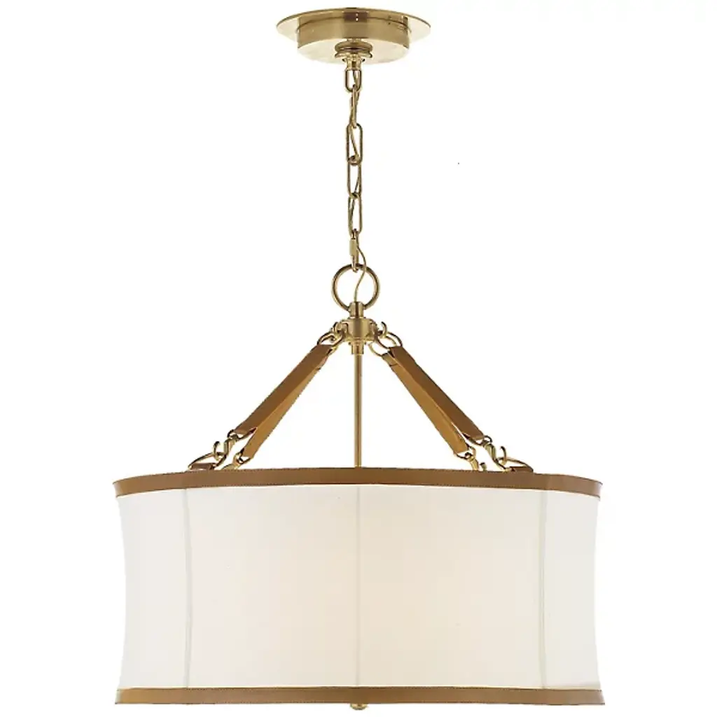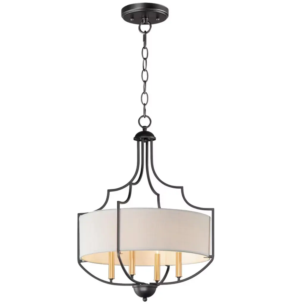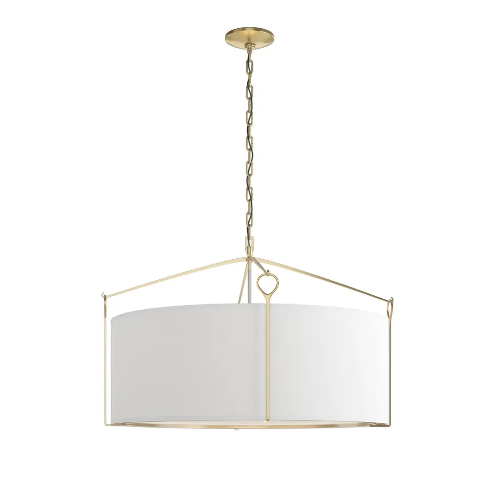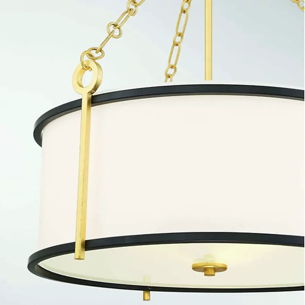 Elegantly composed with lovely contrasting details. The Kian Pendant is a transitional piece from Savoy House. The drum-like bodice of the pendant is made of white fabric with metallic banding in a matte black finish. Contrasting finishes of true gold can be seen along the chain link, stems, and canopy. Regardless of where you choose to place it, the Kian Pendant is a fine choice of illumination that possesses a heightened aesthetic.